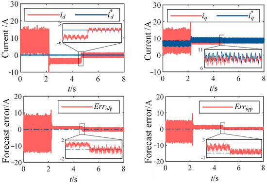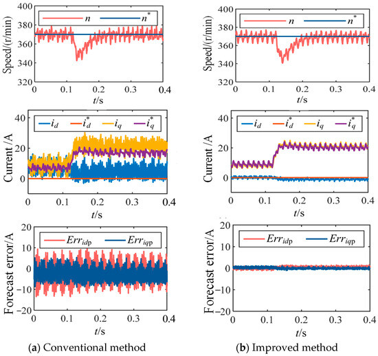 Additionally, to verify the system stability and control performance of the proposed method under load variations, a sudden load increase experiment was conducted under low carrier ratio conditions. When the machine was operating at the rated speed of 370 r/min with a control frequency of 2 kHz, a 150% load step was applied (from 47 N m to 119 N m). The comparative experimental results using the conventional and proposed methods are shown in Figure 15. The results show that with the conventional method, the tracking performance of the d and q axis currents is poor and unstable before and after the load change, indicating that operating conditions significantly affect algorithm performance, and the prediction error is large. In contrast, the improved method maintains nearly zero prediction error before, during, and after the load transient, while preserving high tracking accuracy of the d and q axis currents. This confirms that the proposed method maintains high prediction accuracy and good control performance during dynamic processes and under various operating conditions, with minimal influence from load variations.