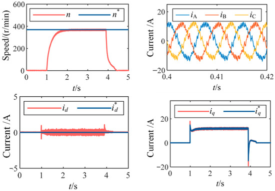 Compared with Figure 3, it can be observed that the improved method achieves better tracking of the d and q axis current references and exhibits superior dynamic and steady-state performance in the current loop. Meanwhile, the speed remains stable at 370 r/min without steady-state error. This indicates that the deadbeat control strategy based on the improved voltage model and coordinate system synchronization eliminates the model errors caused by discrete control delay and rotor rotation effects under low carrier ratio conditions, thereby achieving accurate decoupling between d and q axis variables.