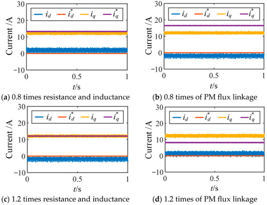 To verify the robustness of the proposed method against discrepancies between actual and nominal machine parameters, experiments were conducted under machine parameter mismatch conditions, including stator resistance and inductance mismatch, as well as rotor permanent magnet flux linkage mismatch. At the rated speed of 370 r/min and a control frequency of 2 kHz, the stator resistance and inductance parameters and the rotor permanent magnet flux linkage parameter in the controller were set to 0.8 and 1.2 times their calibrated values, respectively. The experimental results are shown in Figure 16. The results indicate that compared to variations in the rotor permanent magnet flux linkage, changes in the stator resistance and inductance parameters have a smaller impact on the performance of the proposed method.