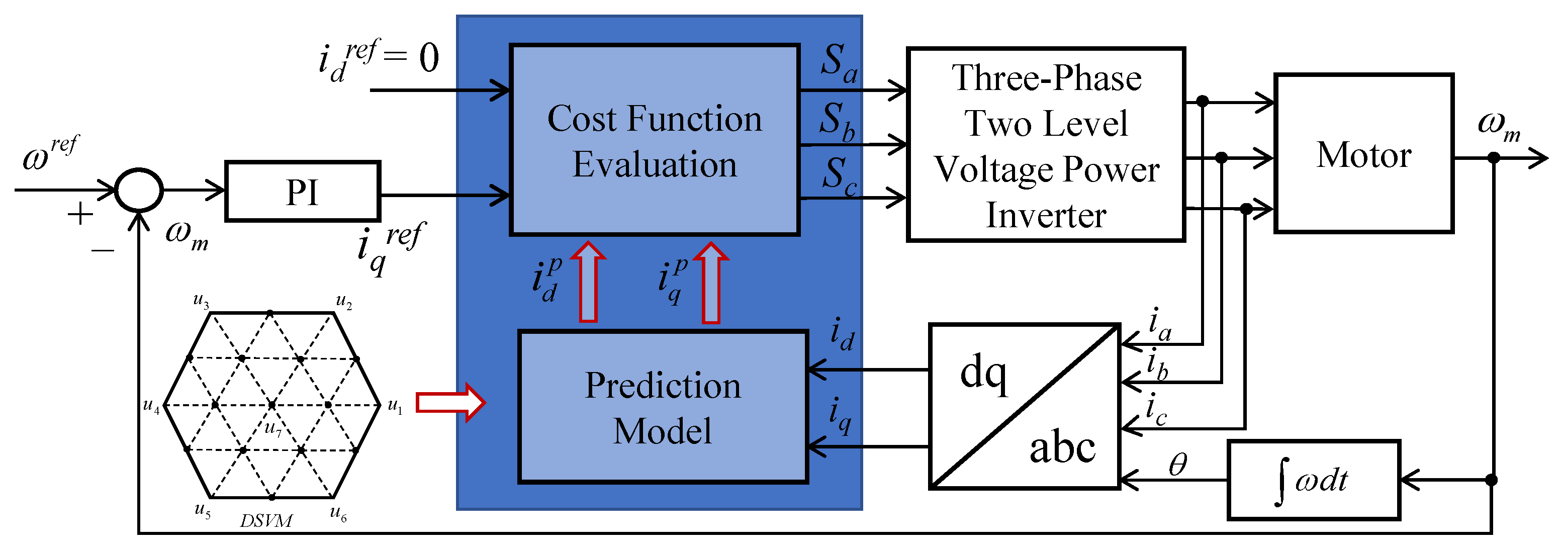 Based on the discrete mathematical model of the motor, the predicted values of the d q -axis currents corresponding to all possible voltage vectors including virtual vectors are calculated, and the optimal voltage vector is selected through the cost function to be applied in the subsequent control cycle.