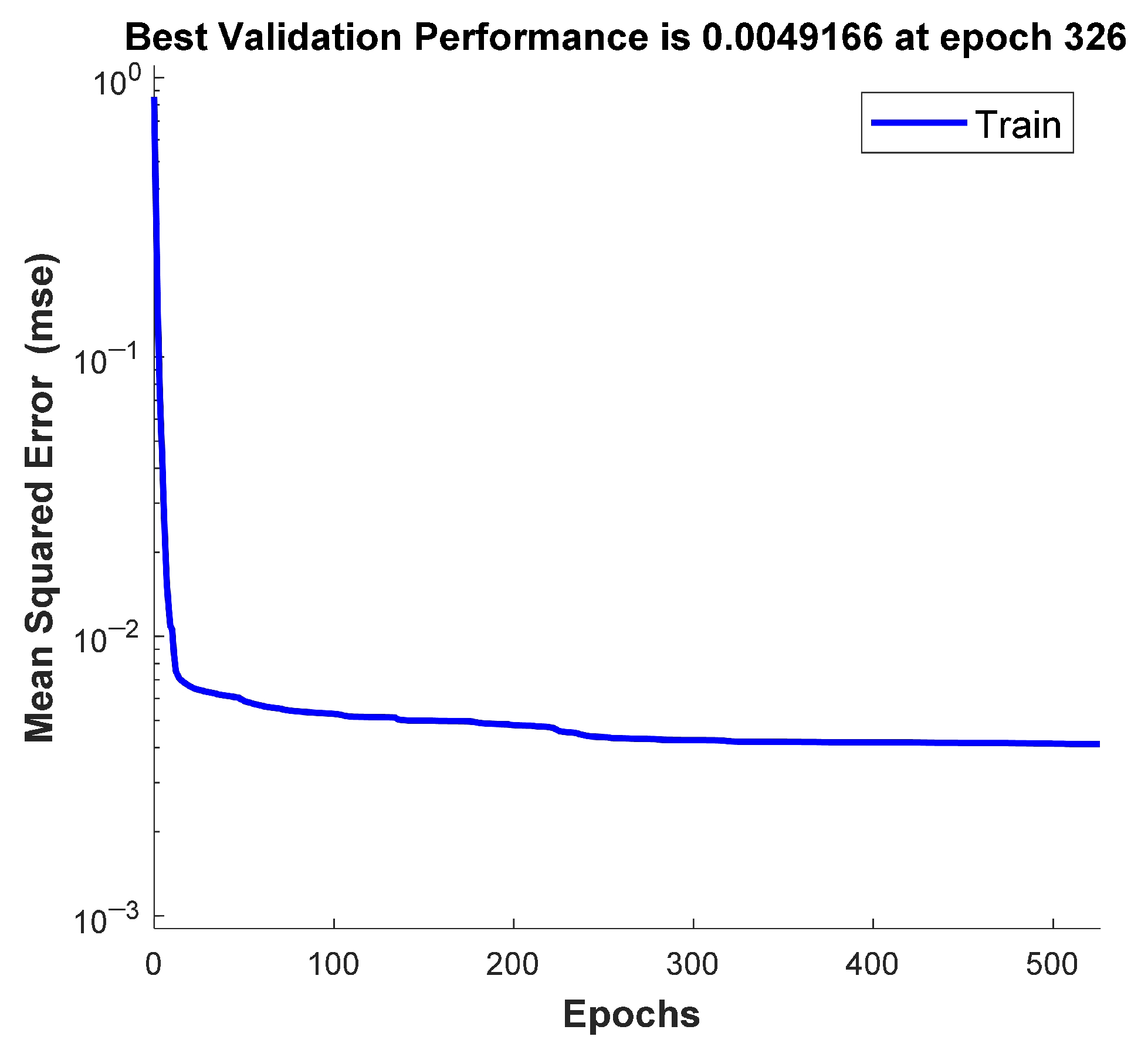 Table 1 shows critical parameters in motor simulation. Figure 4 shows the best MSE during the neural network training process. The internal parameters, including weights and biases of the neural network, are randomly initialized, and the MSE decreases as the training progresses, indicating successful convergence. After the training is completed, no further training is required during the real-time control stage of the PMSM system.