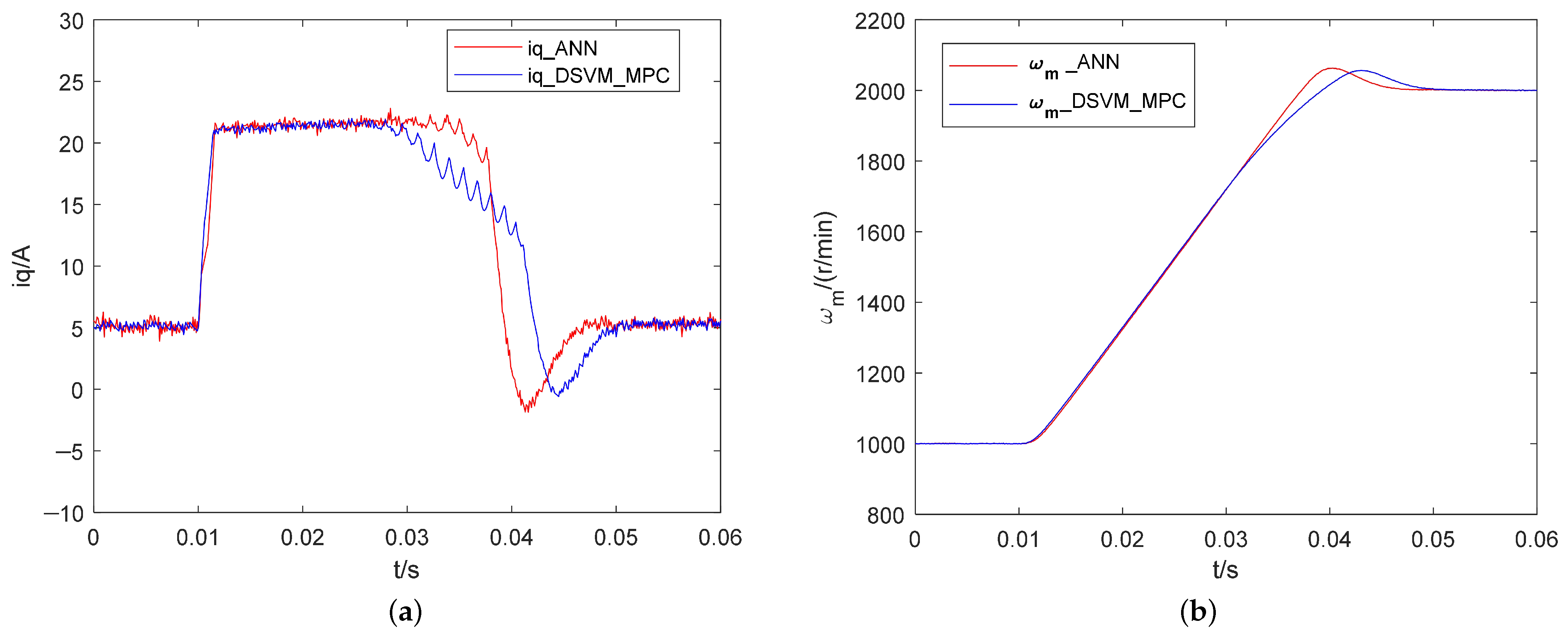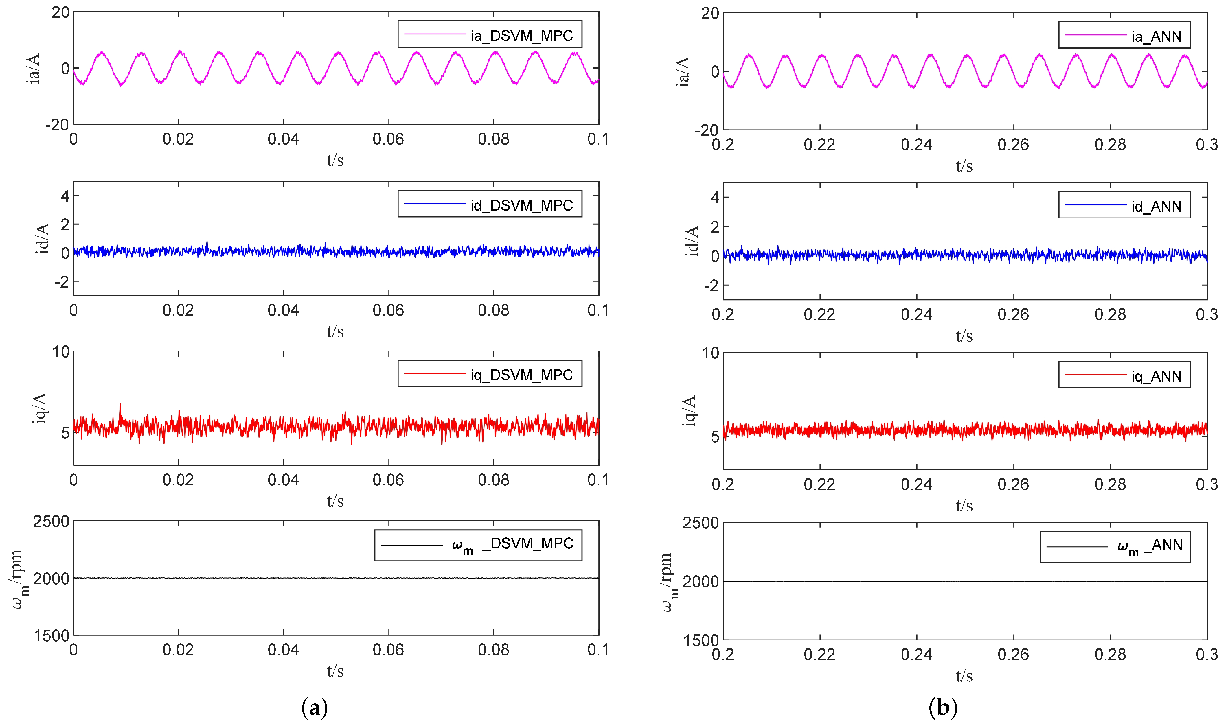 Figure 8 illustrates the responses of the two methods under a speed variation scenario. The machine operates at 1000 rpm and is then accelerated to 2000 rpm. When the q-axis current reference suddenly changes, both methods are capable of achieving very fast transient responses. By comparing the curves, it can be observed that the ANN method demonstrates superior dynamic performance. In terms of the q-axis current, the transient oscillation range of the proposed ANN method is approximately 16−22 A, whereas that of the DSVM-MPC is 10–22 A, indicating a noticeably larger oscillation range. Moreover, the DSVM-MPC-based ANN returns to the steady state more quickly. In addition, the rise time of the DSVM-MPC-based ANN is 0.0396 s, whereas that of the DSVM-MPC is 0.0435 s, indicating that the ANN achieves a noticeably faster speed response. The settling time of the proposed ANN is 0.0468 s, compared with 0.0512 s for the DSVM-MPC, showing that the system reaches stability 8.6% faster. This improvement can be attributed to the enhanced capability of the DSVM-MPC-based ANN, which, after offline training, is able to capture system nonlinearities better and thus respond more promptly to speed variations.