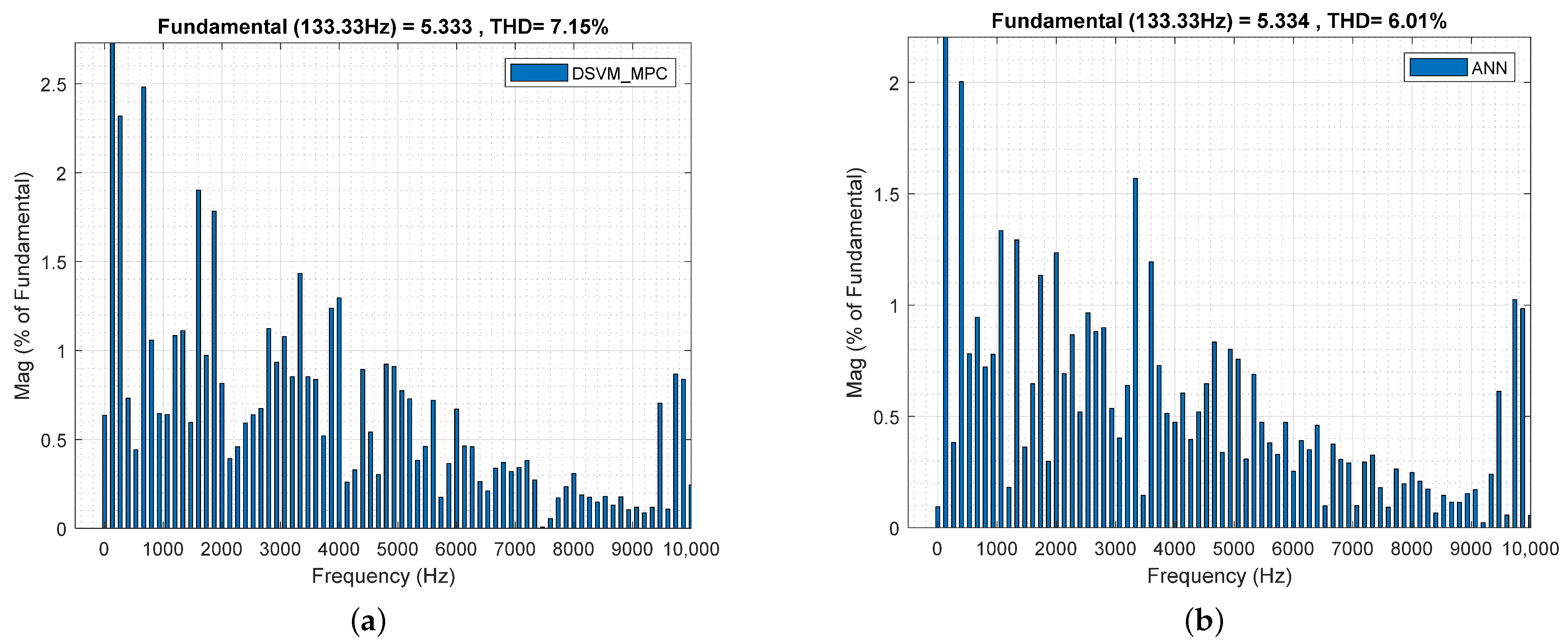 Figure 7 presents the THD analysis of the steady-state A-phase current under two different methods. It is evident that the total harmonic distortion decreases by 15.9%, from 7.15% to 6.01%, indicating that the proposed ANN yields lower current harmonics.