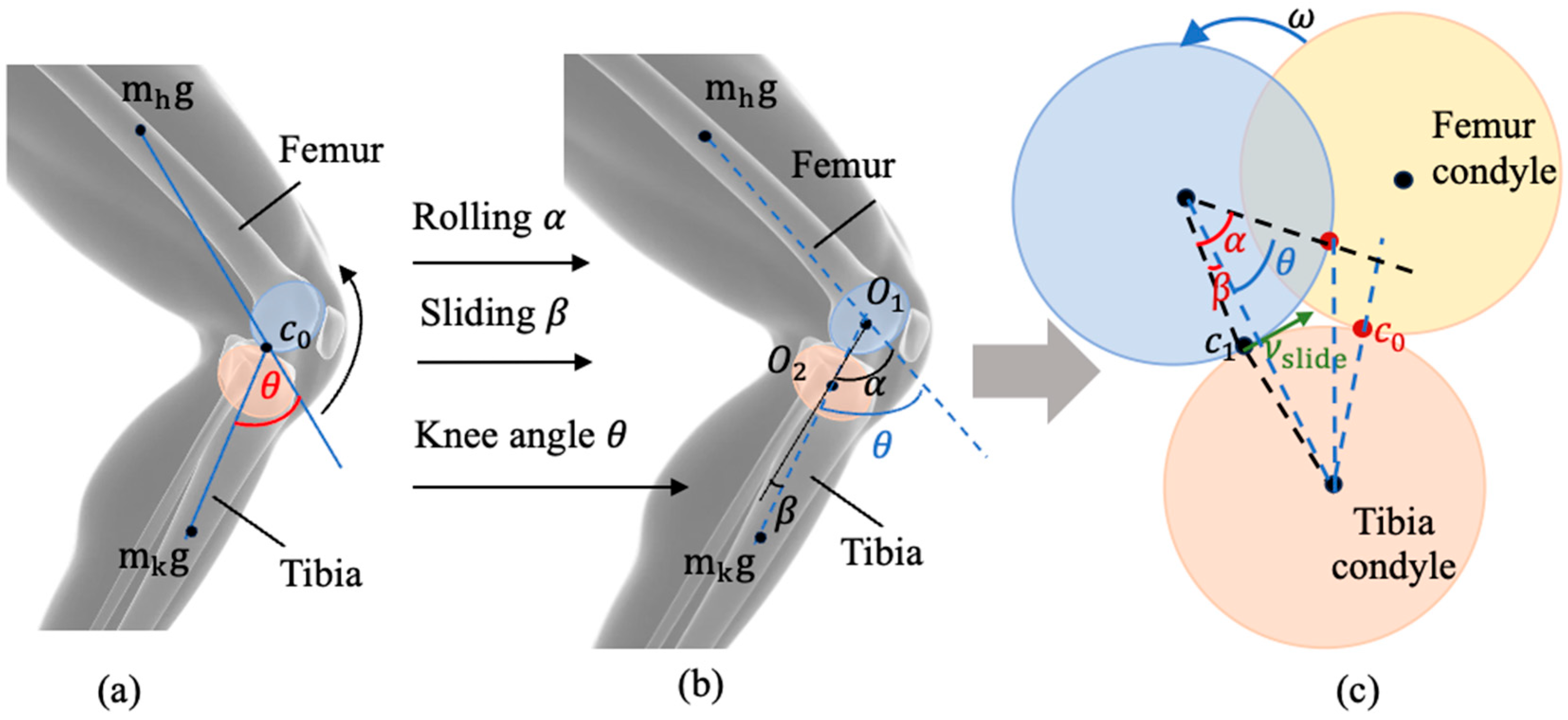 Following the rolling–sliding coupling mechanism, the knee joint motion can be further defined from the perspective of the femoral–tibial contact geometry. In