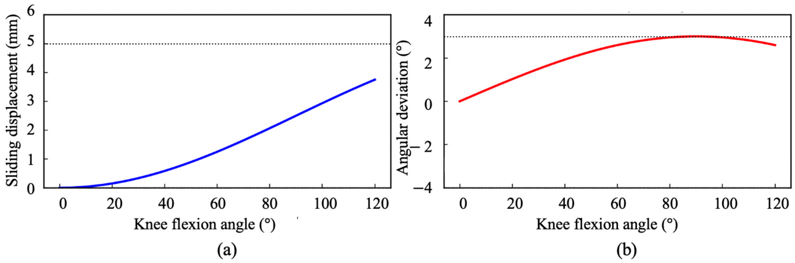 , the proposed rolling–sliding mechanism achieved a substantial reduction in misalignment. Specifically, the average displacement is reduced by approximately 73.49% at the maximum flexion angle of the human knee (