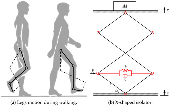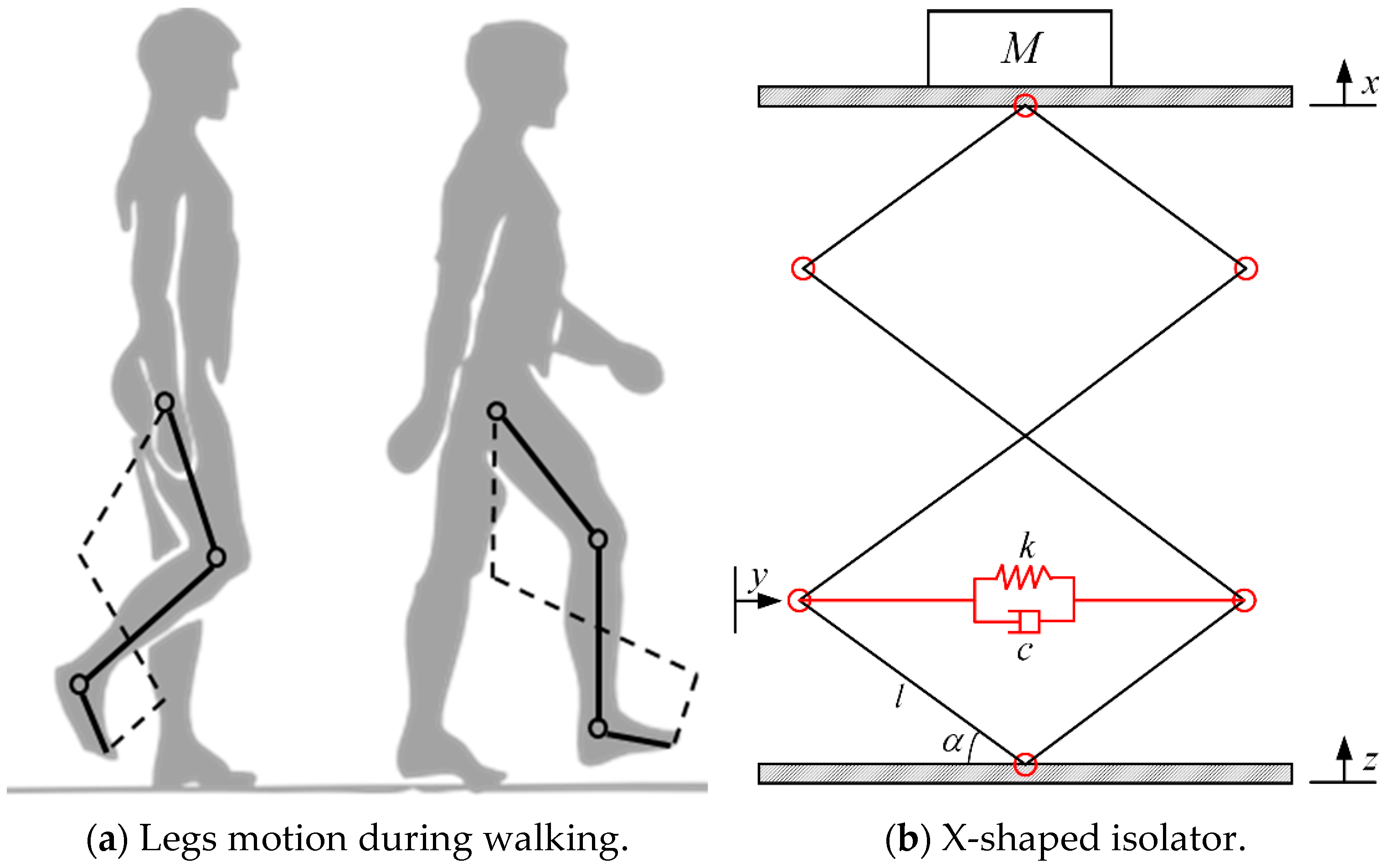 As shown in Figure 1, the biomimetic NXVIS (Figure 1b) draws inspiration from the biomechanical configuration of the human leg during gait, with clearly labeled structural parameters. The target vibration isolation layer M is supported by the X-shaped structure. The bar length and initial installation angle of the X-shaped structure are l and α, respectively. The displacements of the top layer and the ground are x and z, respectively. A spring and damper are placed at the bottom of the NXVIS, with their stiffness and damping coefficients being k and c, respectively. Findings from the literature confirm the capability of the X-shaped isolator to achieve high static stiffness concurrently with low dynamic stiffness [22]. In this model, the bars of the X-shaped structure are considered rigid bodies. Thus, the system’s deformation arises solely from the spring and damper, and the geometric change in the mechanism. Furthermore, the mass and frictional damping of the rods in the X-shaped structure are neglected, and the structure is treated as a massless rigid connection. This practice of ignoring the mass of the bar and friction damping does not affect the generality of the conclusions, which has been confirmed in previous studies [22,31].