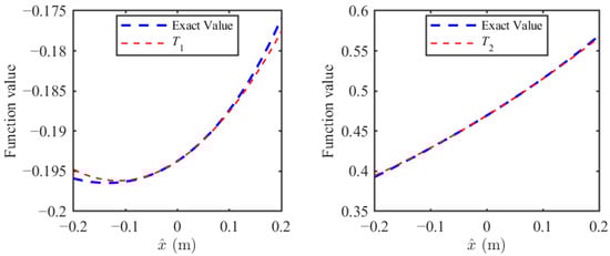 where the coefficients ε 0 ε 7 are listed in the Appendix B. The accuracy of the Taylor expansion was evaluated by comparing the approximated terms (T1, T2) with the exact stiffness and damping terms within the specified working range (parameters provided in Appendix A). According to the motion range of the deck layer of the jacket offshore platform under typical seismic loads, the applicable range of the Taylor expansion is selected as ±0.2 m. The specific results can be obtained from Section 4. The comparative outcomes are summarized in Figure 3.