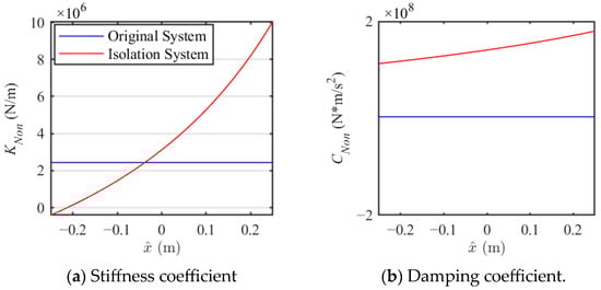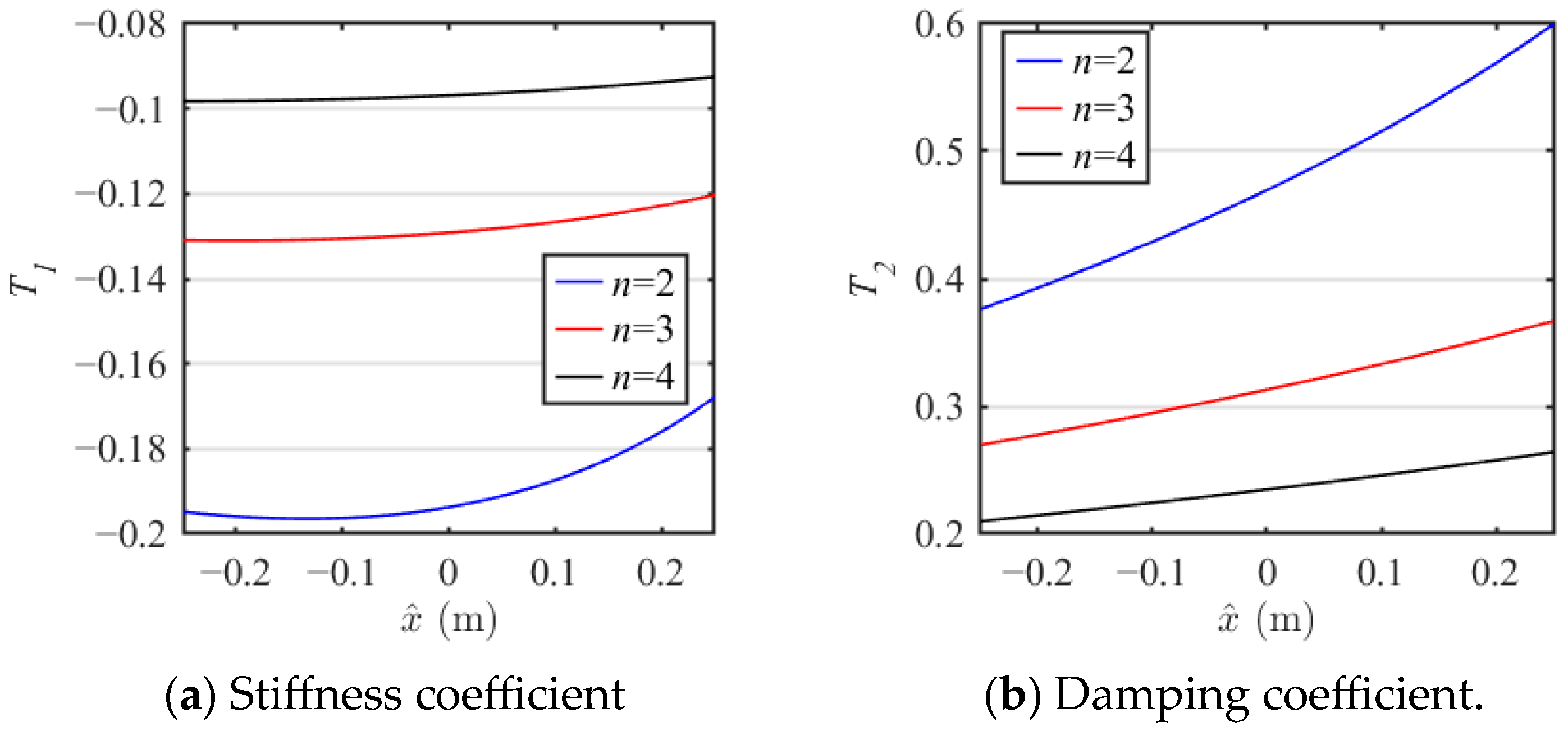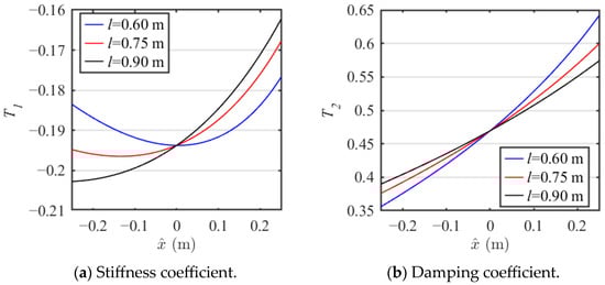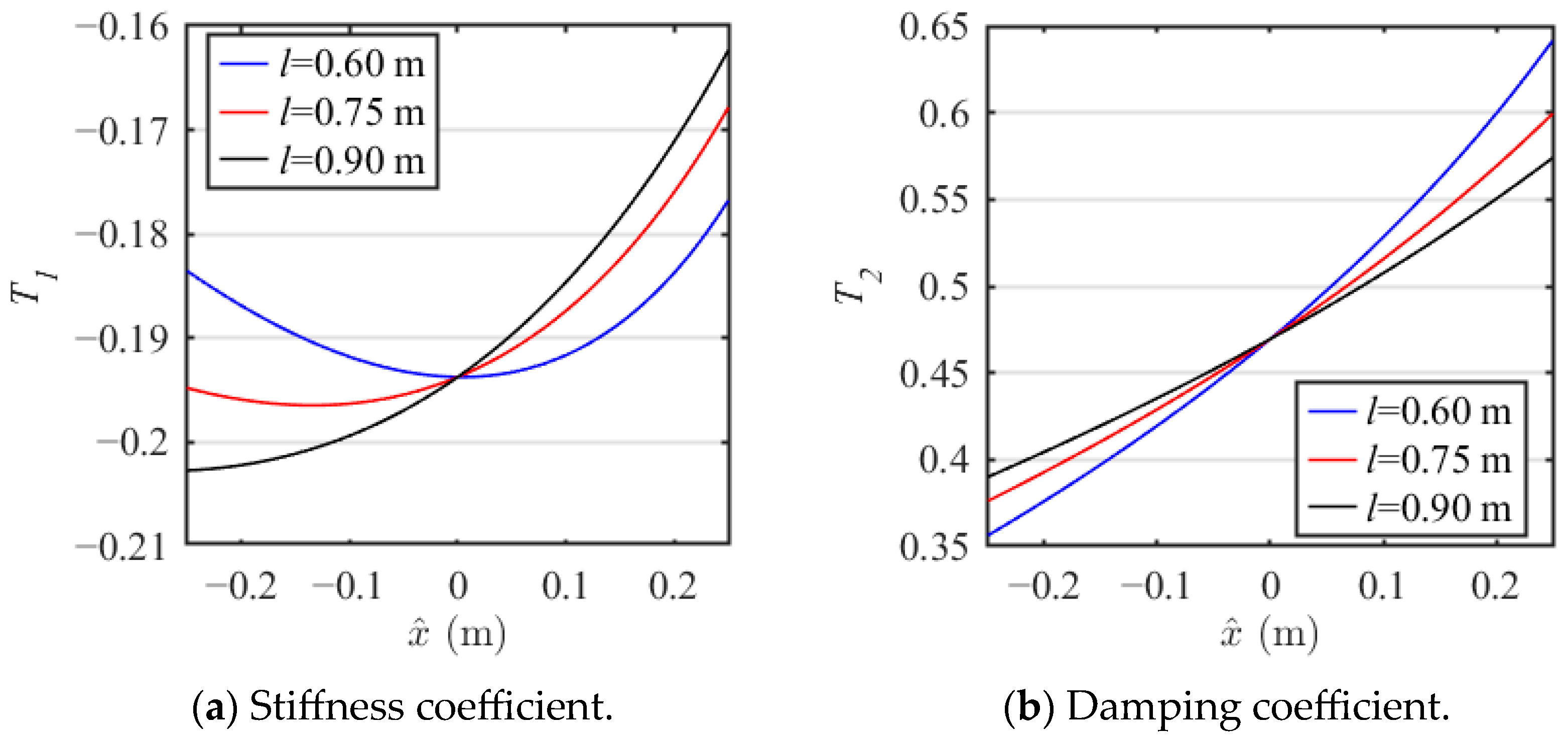 The nonlinear stiffness coefficient T1 and the nonlinear damping coefficient T2 versus displacement x ^ for bar length l ranging from 0.60 m to 0.90 m is shown in Figure 5. It can be seen that the stiffness coefficient T1 and the damping coefficient T2 are constant at x ^ = 0. As bar length l increases, the stiffness coefficient T1 gradually decreases in the compression range and increases in the extension range. The nonlinearity is strongest when bar length l is small. The damping coefficient T2 exhibits an opposite relationship with bar length l as the stiffness coefficient T1.