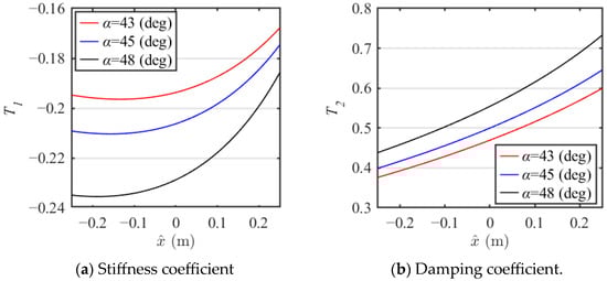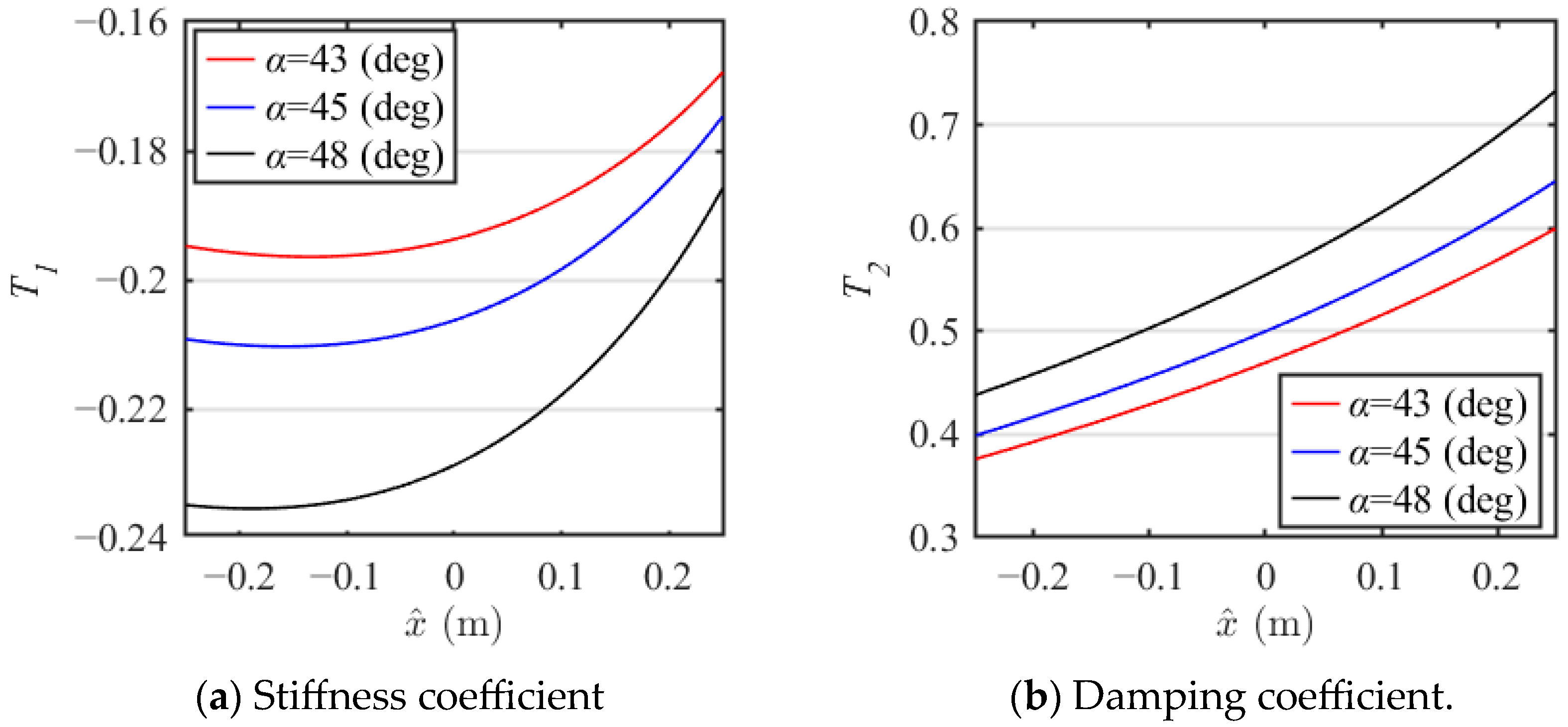 Figure 6 shows the nonlinear stiffness coefficient T1 and nonlinear damping coefficient T2 versus displacement x ^ , as the initial installation angle α changes from 43° to 48°. As can be seen, both the value and nonlinearity of the nonlinear stiffness coefficient T1 increase with decreasing angle α. This is because a smaller initial installation angle α brings the NXVIS closer to the quasi-zero range, resulting in smaller stiffness. The relationship between the nonlinear damping coefficient T2 and the initial installation angle α is opposite to that of the nonlinear stiffness coefficient T1.