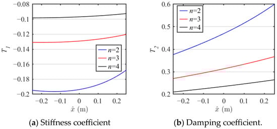 The number of layers n of the NXVIS changes from 2 to 4, and the nonlinear stiffness coefficient T1 and the nonlinear damping coefficient T2 with respect to the displacement x ^ are shown in Figure 7. It can be seen that with the increase in the number of layers n, the value of coefficient T1 rises significantly, but the nonlinearity decreases. The nonlinear damping coefficient T2 exhibits an opposite relationship to the nonlinear stiffness coefficient T1, but the rate of change is increasing with decreasing layer number n.