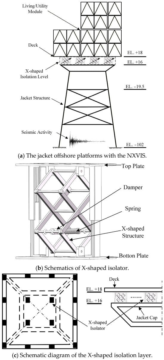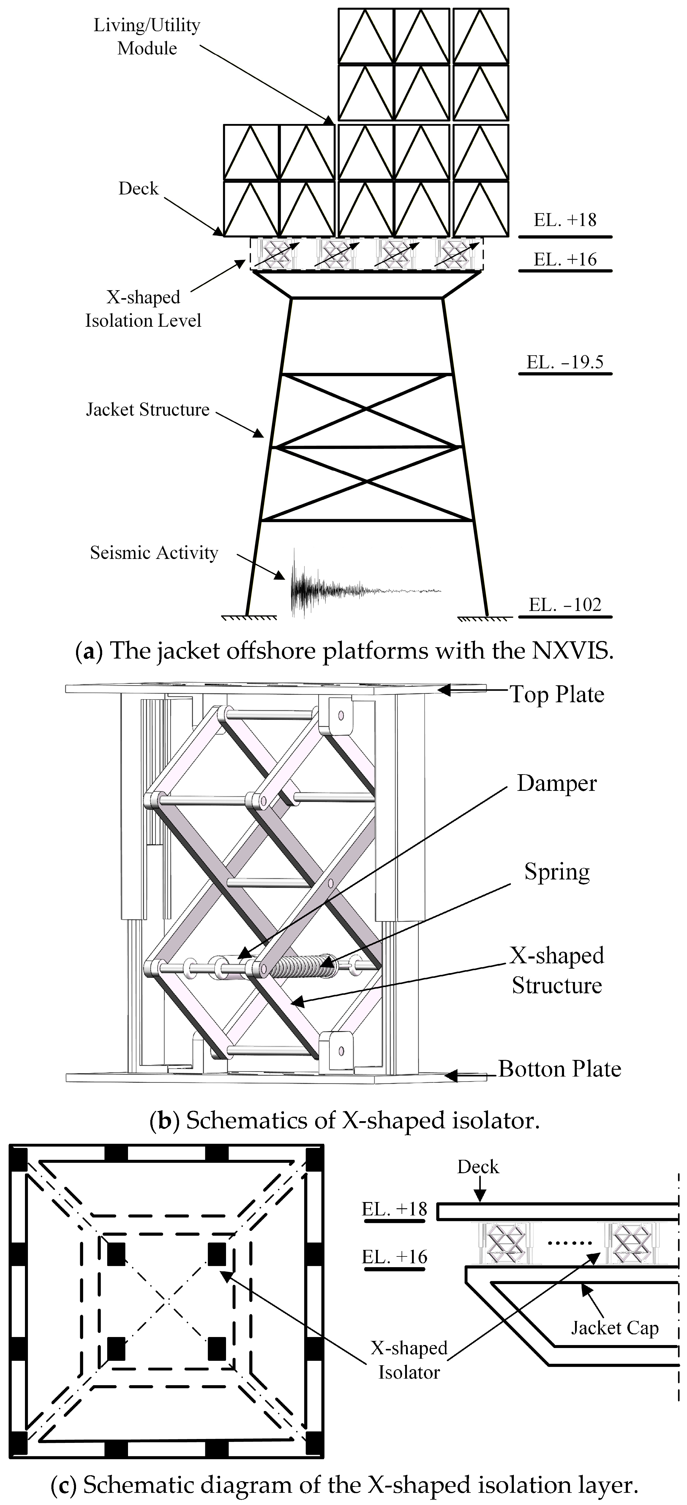 In recent years, passive vibration isolators, developed by leveraging the advantages of nonlinearity, may offer an effective solution. Traditional linear passive vibration isolators cannot resolve the contradiction between low-frequency vibration isolation and load-bearing capacity [21]. To isolate low-frequency vibrations, it is necessary to reduce stiffness; however, soft springs exhibit large static deformations and suffer from poor static stability and load-bearing capacity. An ideal vibration isolation system should meet the requirements of low-frequency and broad-band frequency vibration suppression without reducing the system’s load-bearing capacity [22]. Nonlinear passive vibration isolation systems represent a significant advancement in the field, marking a transition from static, fixed-performance technologies toward dynamic and adaptively capable solutions. Through ingenious mechanical design, these systems achieve nonlinear dynamic characteristics that lead to breakthrough performance, particularly in addressing challenges such as ULF vibration isolation and high load-bearing/counter-impact capacity [23,24,25]. To this end, many novel structures or control methods have been proposed to improve vibration isolation performance. For example, the 4-DOF system studied by Amer et al. [12] reveals rich dynamic behaviors, including chaos and quasi-periodicity, which are crucial for understanding the system’s limits. Similarly, in-depth analysis of fundamental nonlinear systems such as planar double pendulums [26] can provide insights into internal resonance and stability, which are fundamental concepts in designing nonlinear vibration control strategies. Other innovative applications and analyses that more directly exploit nonlinearity for vibration isolation include quasi-zero structures, compliant mechanisms based quasi zero stiffness isolator, origami structures, smart materials and bionic X-shaped mechanisms [18,25,27,28,29,30]. Among them, the bionic NXVIS has received widespread attention. This method is inspired by the vibration-suppressing properties of animal legs/limbs. Jing’s research team has developed a large number of simulated nonlinear X-shaped anti-vibration methods and conducted in-depth research on nonlinear stiffness, damping, and inertia, proving the reliability of the NXVIS [22]. Due to its excellent nonlinear adjustable characteristics, it enables the design of passive isolators that combine low dynamic stiffness with high load-bearing capacity, achieving tunable ULF and broadband vibration suppression [22]. In addition, the nonlinear damping in the system can achieve energy dissipation, further reducing the amplitude of structural vibration. It is well known that the deck layer is the part with the most concentrated mass of the offshore platform and is also an important place for oil and gas production and workers’ living [3]. The nonlinear characteristics of the NXVIS mean that the isolation system can achieve ULF and broadband vibration suppression under seismic loads while ensuring the stability of the deck layer. However, there are no published reports on the results of using the biomimetic NXVIS for offshore platform vibration control under seismic excitation.