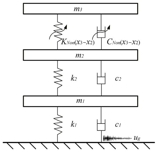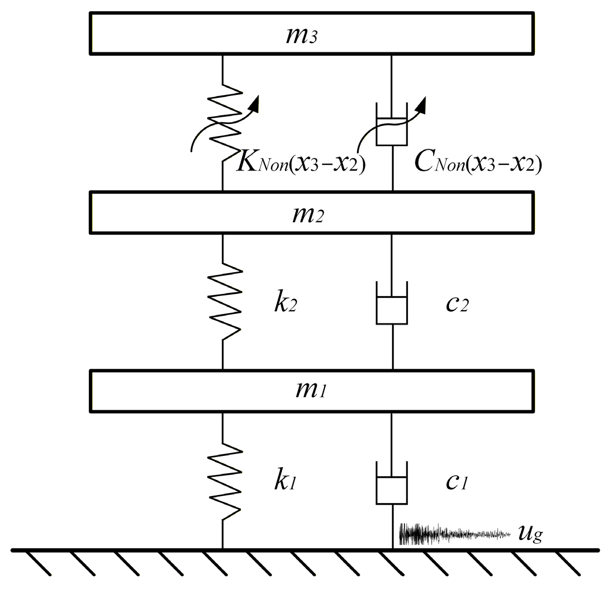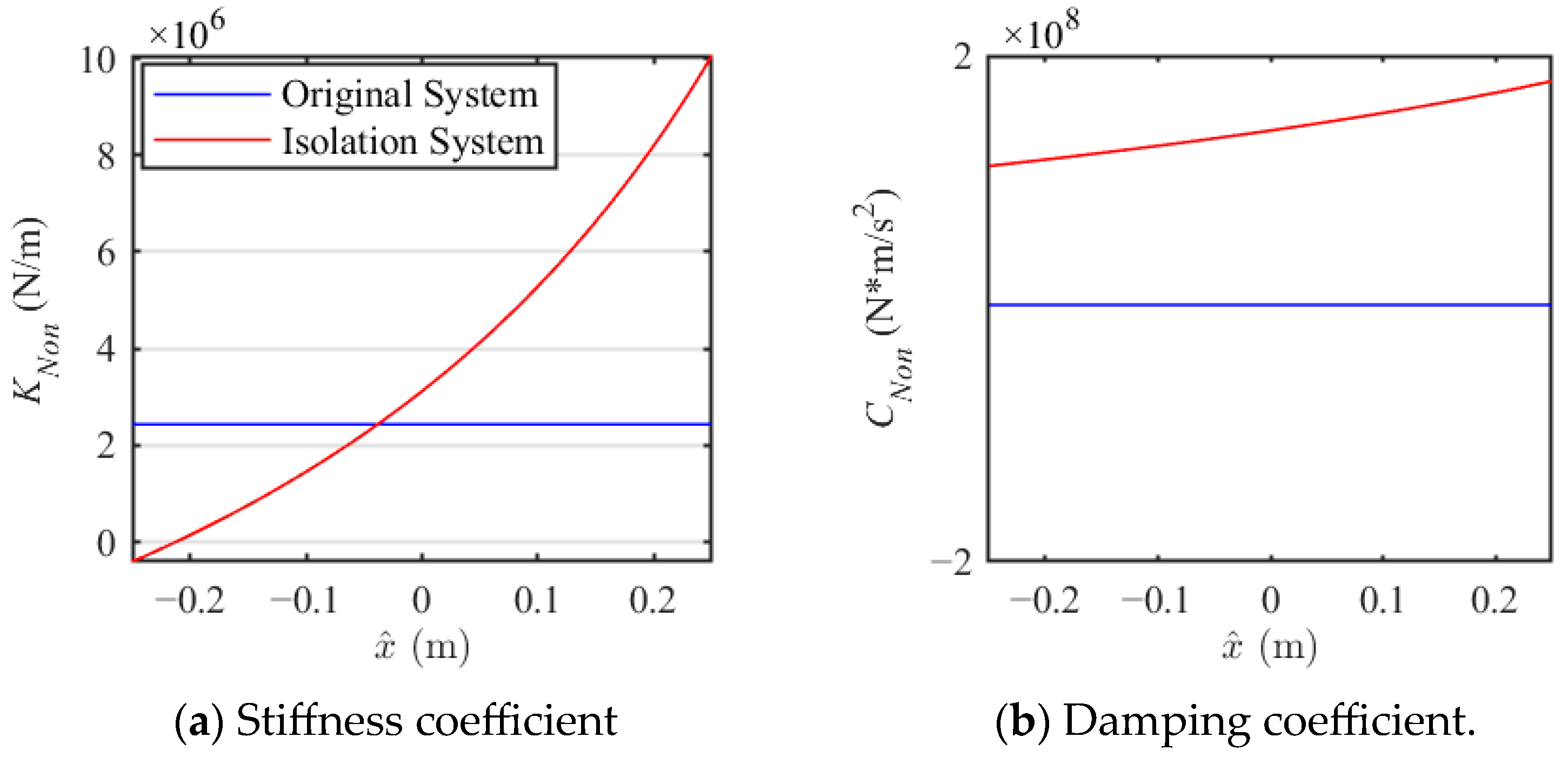 Based on the dynamic characteristics of the NRB’ platform and the designed NXVIS, a simplified 3-DOF platform with NXVIS is shown in Figure 12. In Figure 12, KNon and CNon are the dynamic stiffness and damping related to the relative displacement between layers, which can be expressed as