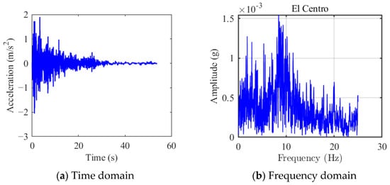 Figure 13 shows the Imperial Valley earthquake of 18 May 1940, known as the El Centro earthquake. It is one of the most famous and widely used seismic loads in the world and is a very representative example. Figure 13a shows that the seismic signal initially has concentrated energy and a large response amplitude, but the energy gradually decays over time. Figure 13b shows the El Centro earthquake in the frequency domain. The earthquake has two frequency peaks, at 1.88 Hz and 8.43 Hz, with the major energy concentrated between 1.0 Hz and 10.0 Hz. This indicates that larger earthquakes release more low-frequency energy, and vibration control for jacket offshore platforms should primarily address these extreme seismic loads.