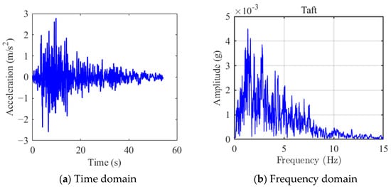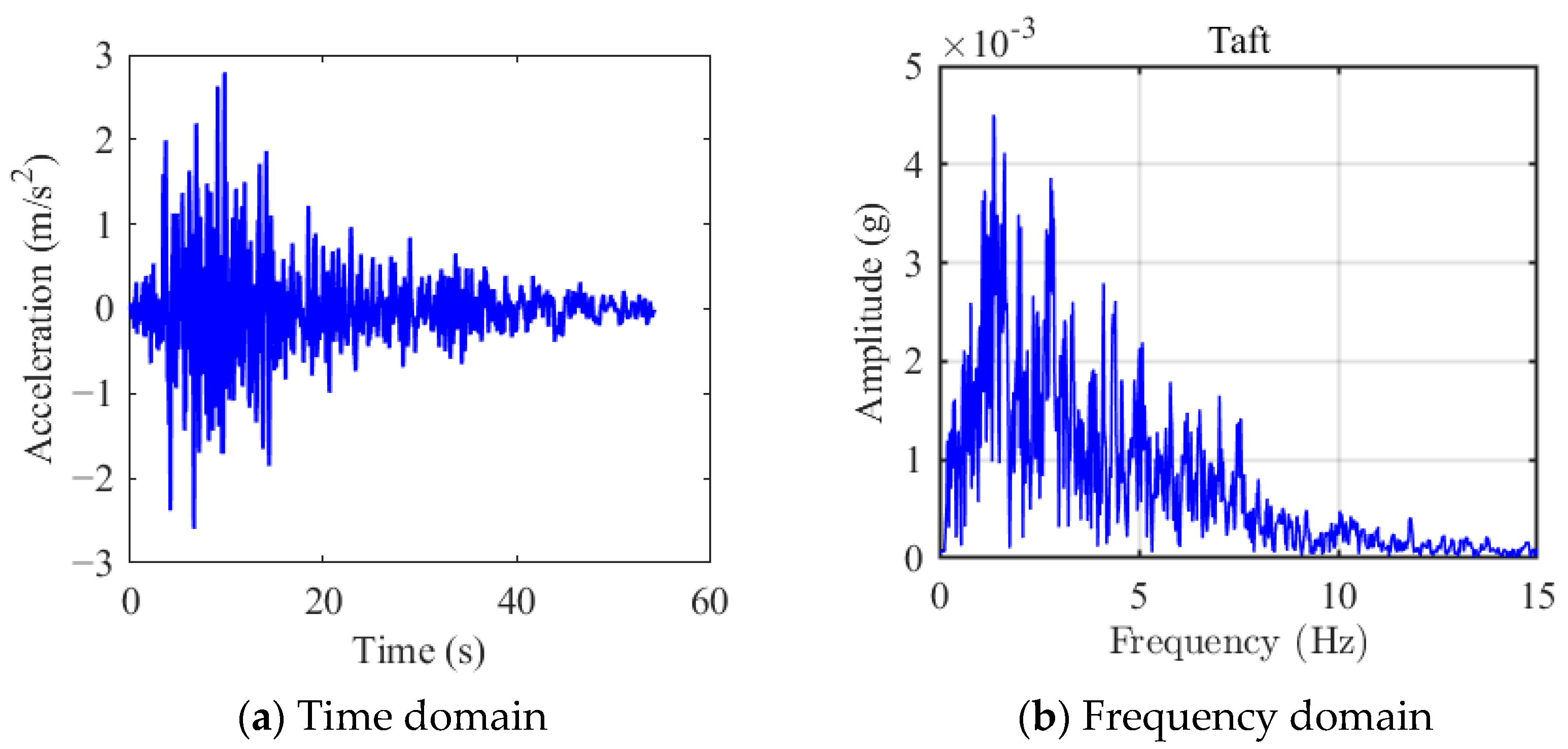 Figure 14 shows the seismic acceleration recorded at a seismic station in Taft, California, during the 1952 Kern County earthquake, known as the Taft earthquake. It is one of the earliest fully documented strong earthquake records in the world. Due to its high data quality and typical characteristics, it has become a standard seismic load recognized by international society, widely used in seismic performance testing of structures such as buildings, bridges, and nuclear power plants. As shown in Figure 14b, the Taft seismic load peaks at 1.38 Hz, with most of its energy concentrated between 0.8 Hz and 5.0 Hz.