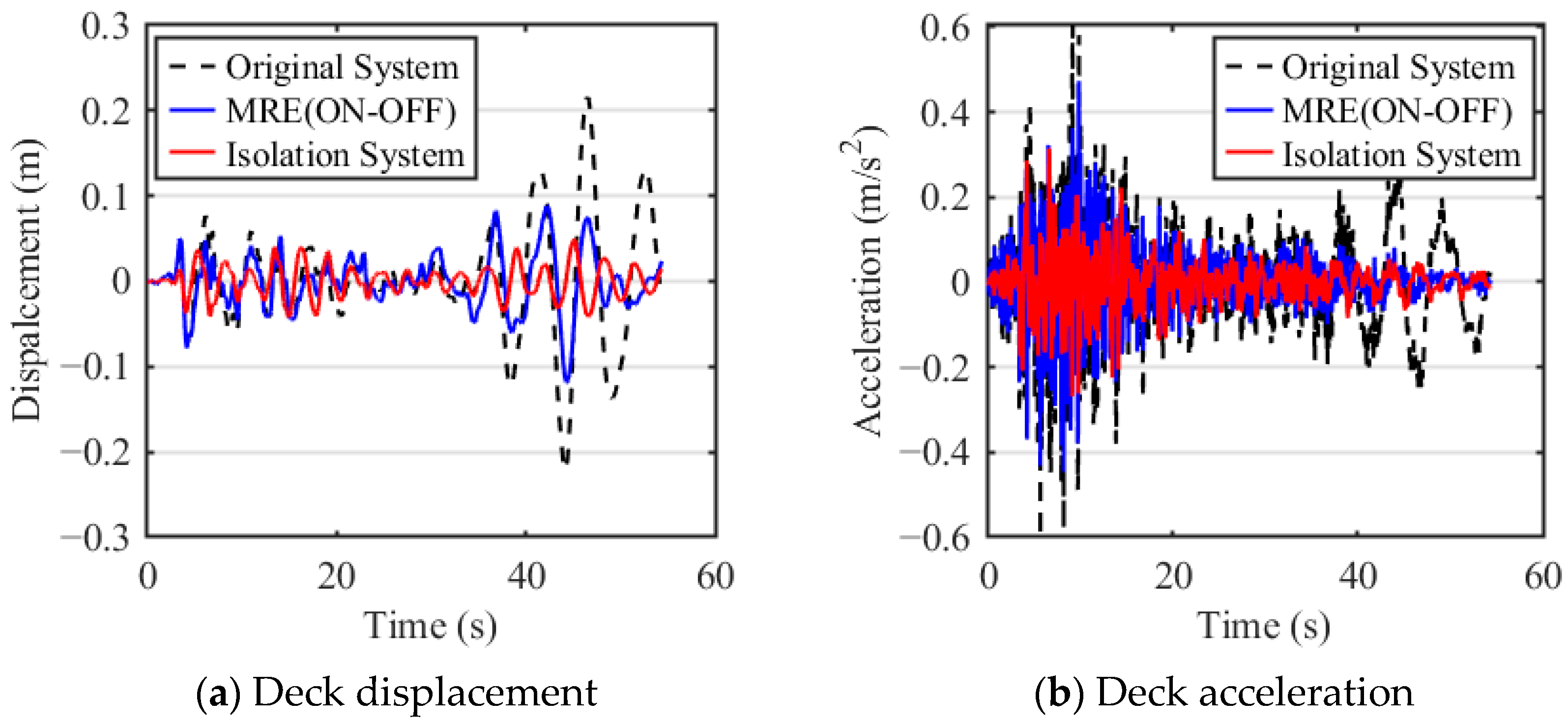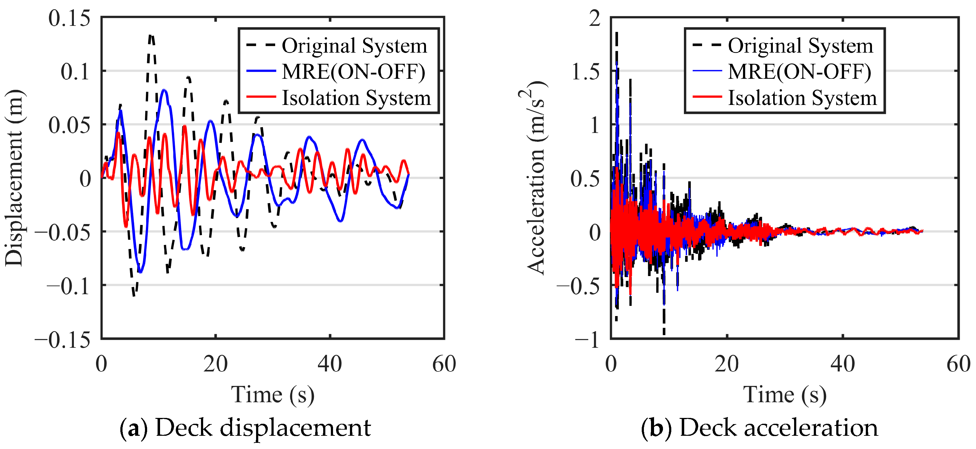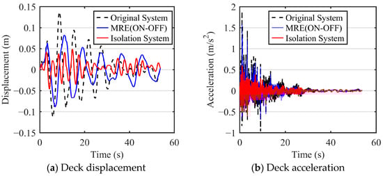 These two types of seismic loads are highly representative, characteristic, and widely applicable, and therefore can well reflect the effectiveness of vibration isolation solutions. Based on these two typical seismic loads and the dynamic model of an NRB’ offshore platform with an X-shaped anti-vibration structure, a numerical analysis of the offshore platform’s vibration performance was conducted. The deck is a crucial area of offshore platforms for oil and gas production and crew life. The displacement response of the deck can cause structural fatigue damage and equipment damage, and in severe cases, even cause the platform to capsize, resulting in significant losses. The acceleration response of the deck can affect staff comfort and the operation of sensitive equipment, ultimately impacting production efficiency and worker health. Therefore, this study focuses on analyzing the structural response of the deck. The results are presented in Figure 15 and Figure 16. It should be clarified that the “Original System” denotes the NRB’ platform without any anti-vibration mechanisms, MRE (ON-OFF) refers to the NRB’ platform with an MRE isolation layer with on–off control (for specific parameters, see Reference [3]), while the “Isolation System” refers specifically to the platform integrated with the NXVIS.