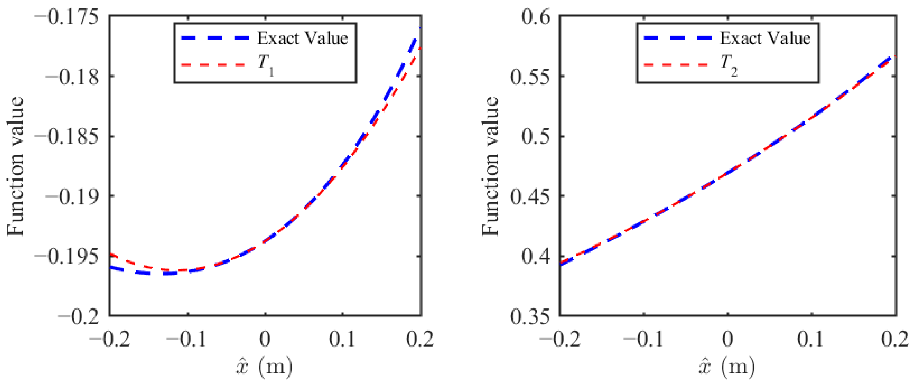 As can be seen from Figure 3, the approximate value obtained by Taylor expansions has a good match with the exact value within the given motion range up to ±0.2 m, which is enough for the following vibration analysis. Therefore, the dynamic motion can be simplified as,