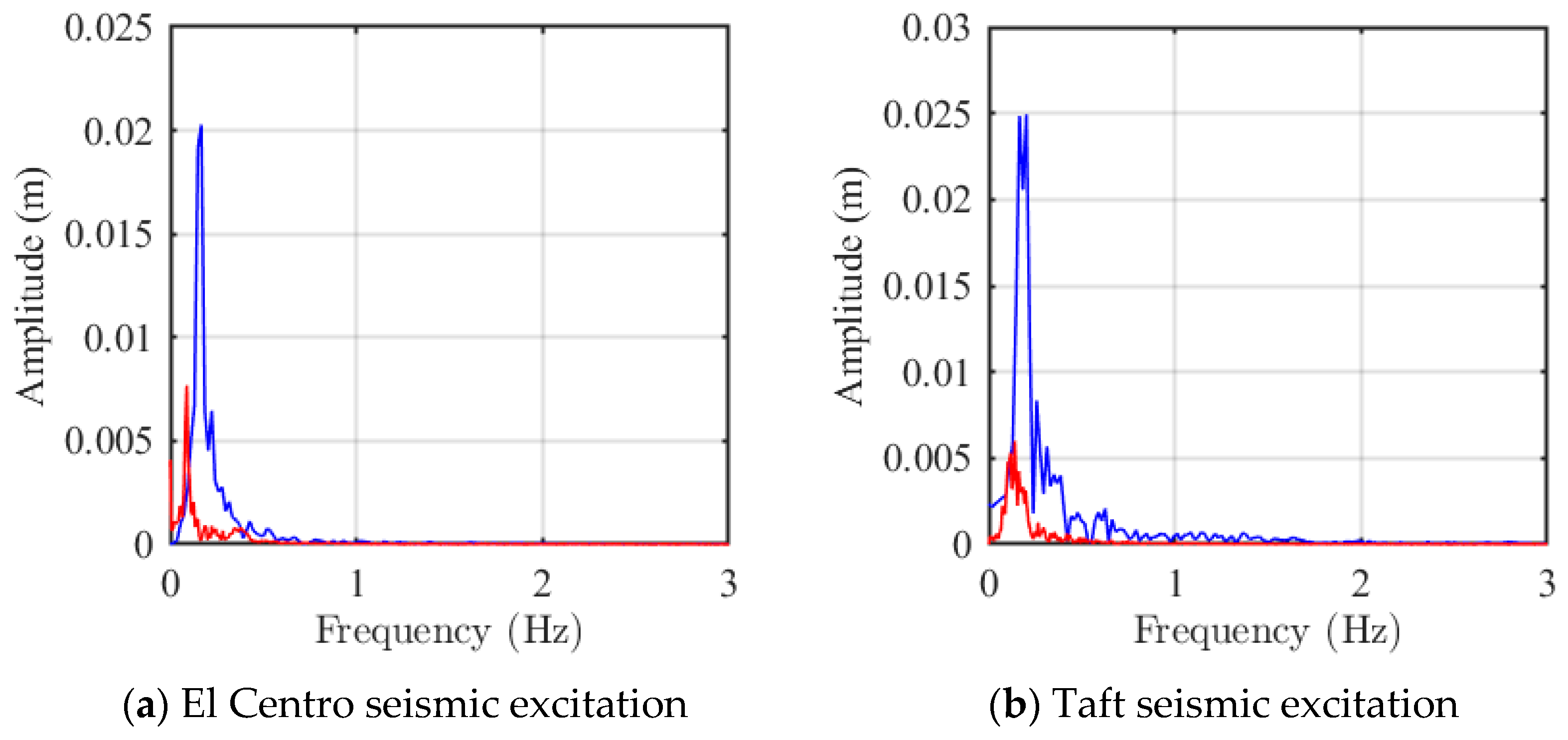 Earthquakes are generally considered to be a predominantly low-frequency excitation. While the energy released by an earthquake encompasses a wide frequency range, its frequency distribution shows that the vast majority is concentrated between 0.7 Hz and 3.0 Hz. This is the primary cause of severe damage to high-rise buildings and long-period structures (such as jacket platforms, suspension bridges and supertall buildings) during large earthquakes. Figure 9 shows that the system’s resonant frequency is 0.3 Hz. Once the frequency surpasses 0.4 Hz, the system transitions into its vibration attenuation zone, confirming the proposed isolation mechanism’s capacity for effective ULF vibration control under seismic conditions loads.