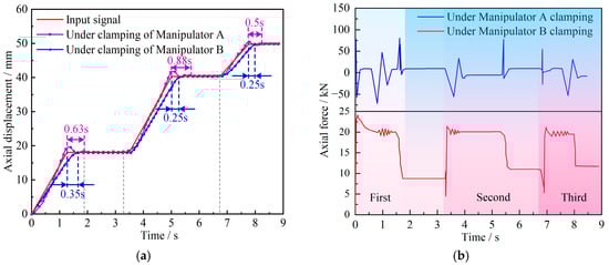 - A joint simulation model combining HTFDSD and the dual forging manipulator clamping system was developed. The dynamic response of the simulated workpiece under typical cooperative operating conditions was analyzed. Results indicate that the dynamic characteristics of HTFDSD are strongly influenced by buffering load: the more severe the load variation, the more pronounced the displacement oscillations; and the larger the load, the more evident the following lag phenomenon.