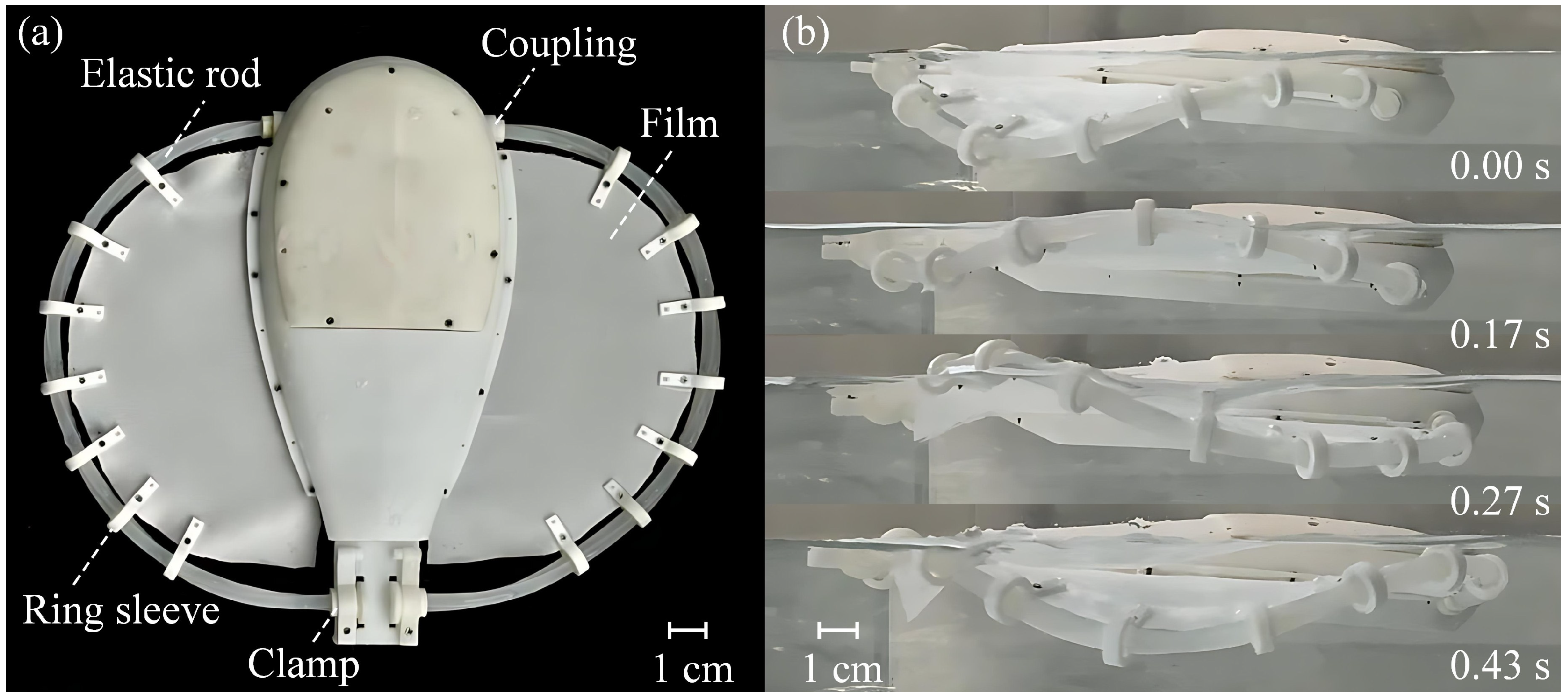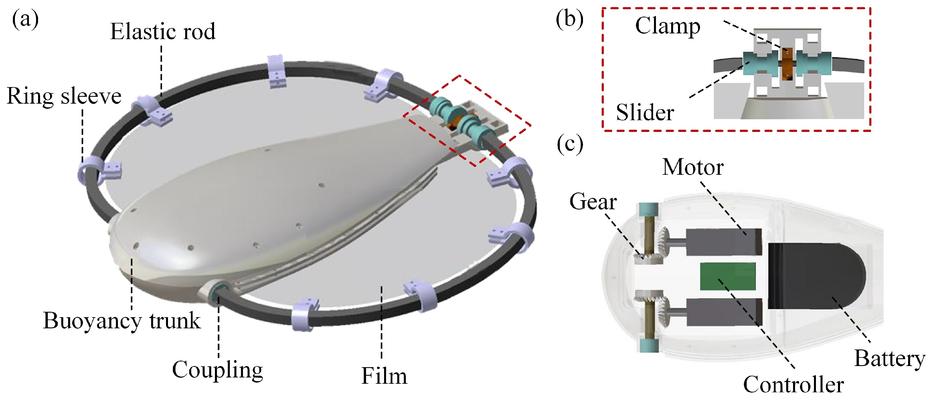 Figure 3b). Ring sleeves are used to connect the rod to the film, which are evenly distributed along the fin rim. The driving devices and controlling circuits are mounted on the trunk (