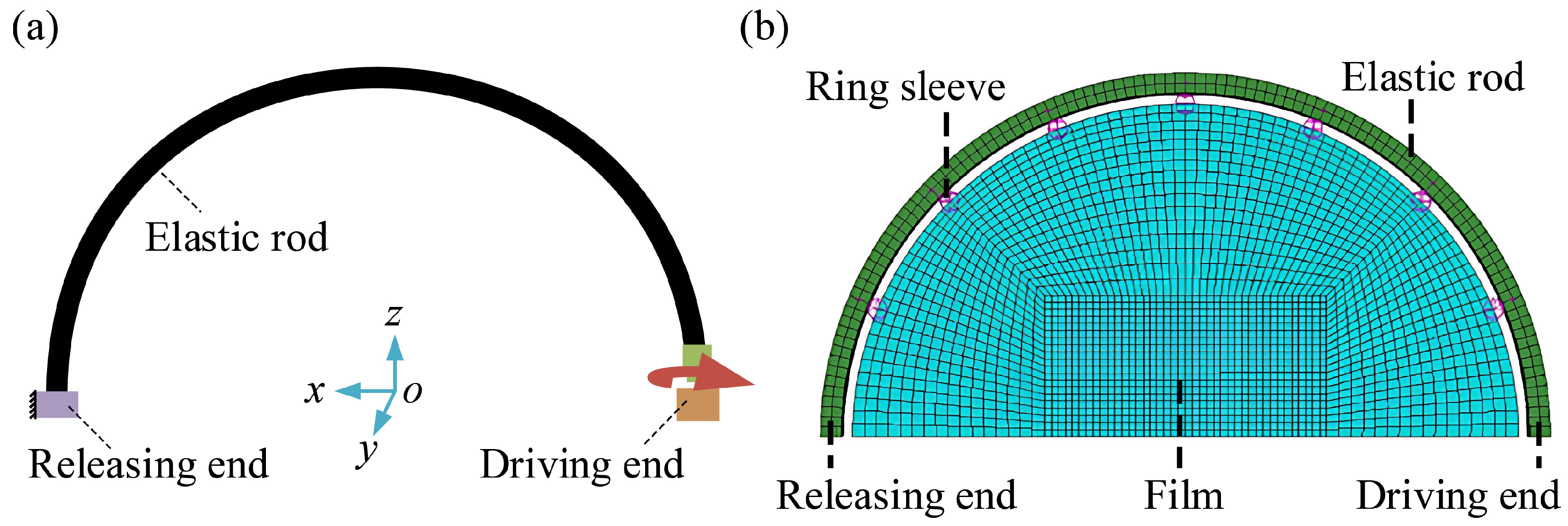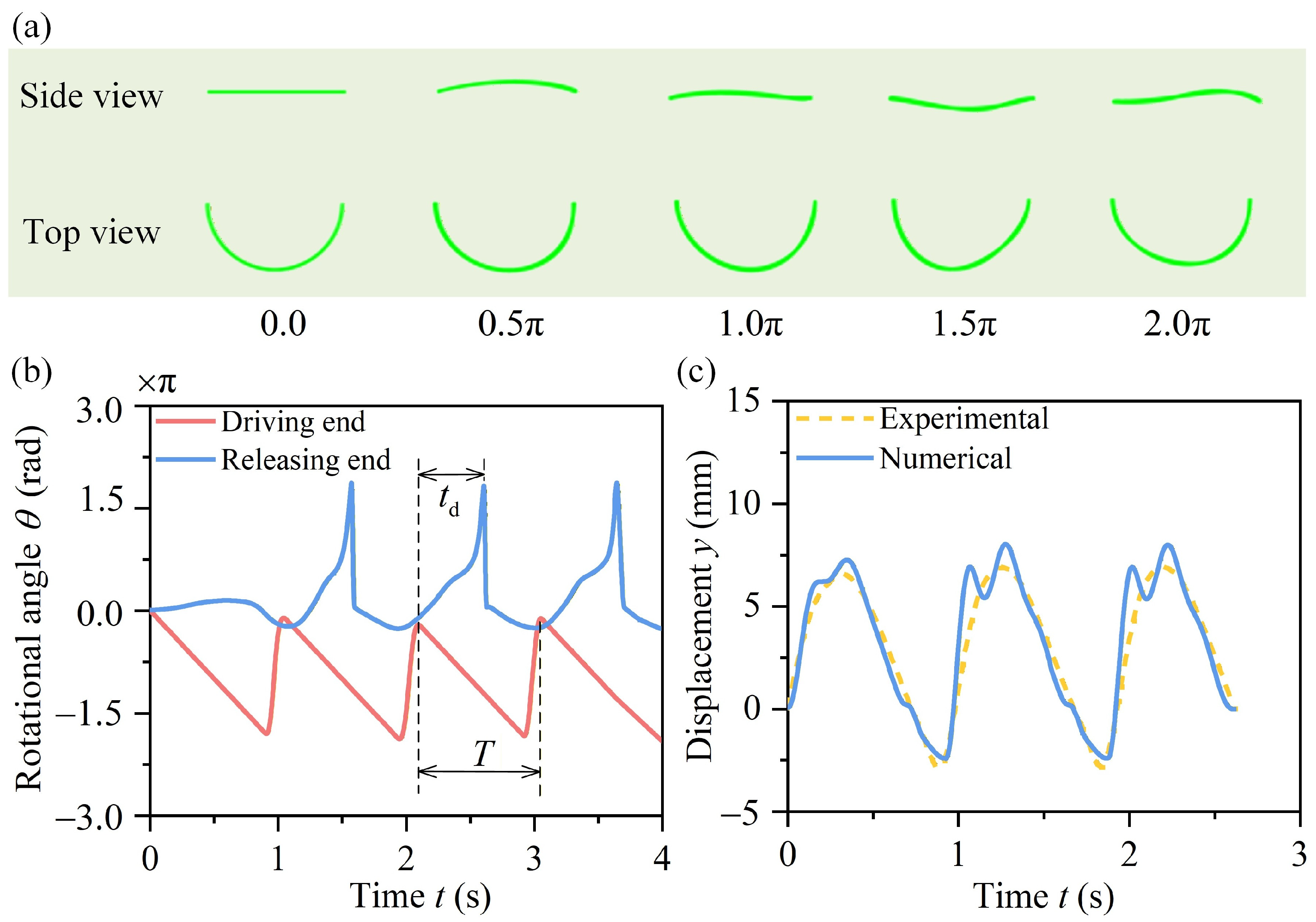 The snap-through simulation is divided into two steps. First, with the releasing end fixed, the driving end rotates along direction in 0–0.9 s. Second, with the driving end fixed, the stored elastic strain energy of the rod is released by rotating the releasing end along direction in 0.9–1 s. Durations for both steps are derived from experimental measurements.