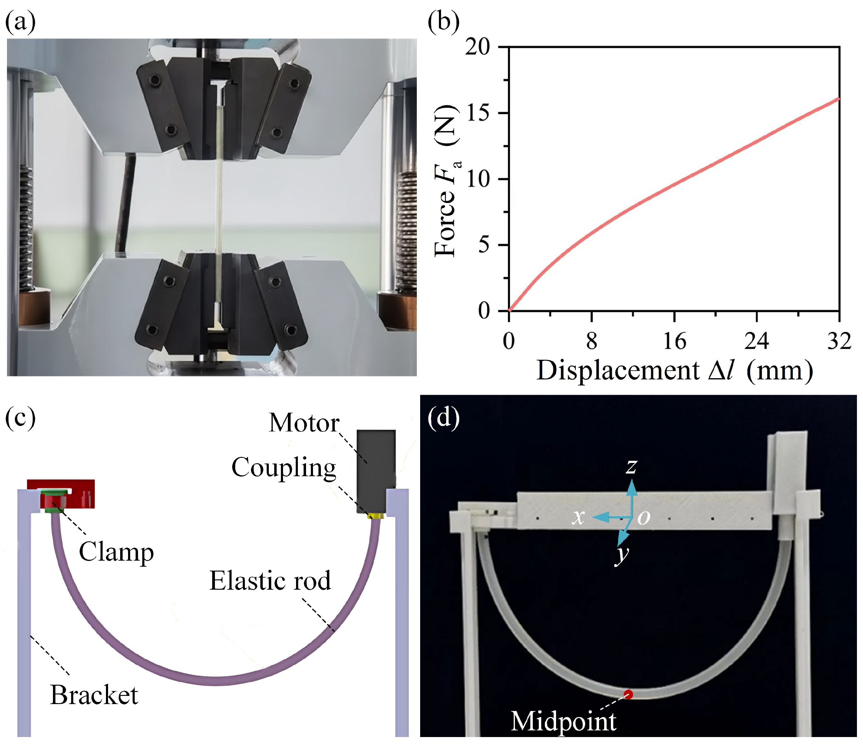 Figure 4a). Replacing the bending process from a straight line into a semicircle, a residual stress field is imposed on the rod. The Poisson’s ratio of the material is set as 0.47. The Young’s modulus is determined by the uniaxial tension test, which is set as 3 MPa. The rod is discretized by 3266 C3D8R elements. The geometric nonlinearity is taken into account to analyze the large deformation of the rod. The effect of environmental resistance on the elastic rod is considered by introducing Rayleigh damping. The damping matrix is calculated as