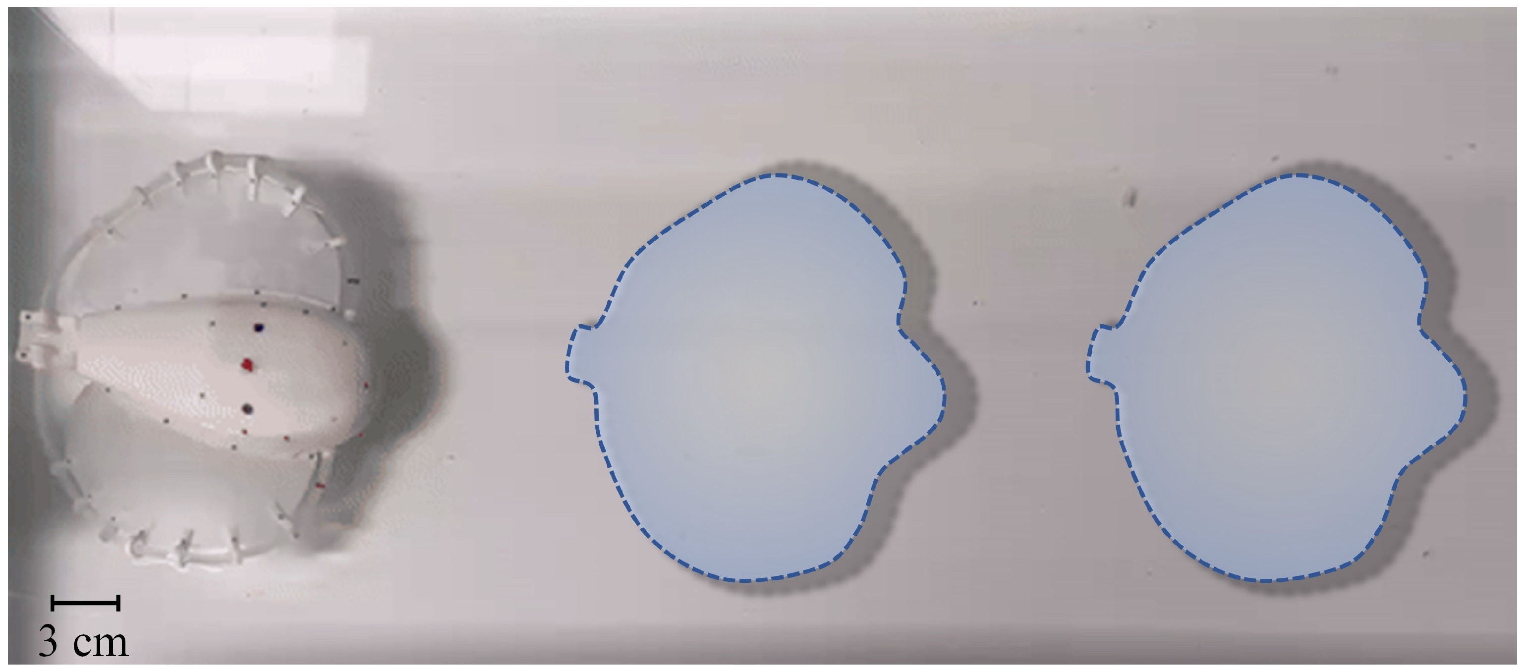 46] designed an untethered, soft robotic ray driven by a dynamoelectric motor. While the structure of the robot is simplified and its energy consumption is reduced, the swimming speed remains relatively low and the maneuverability is limited due to the single-actuator design.