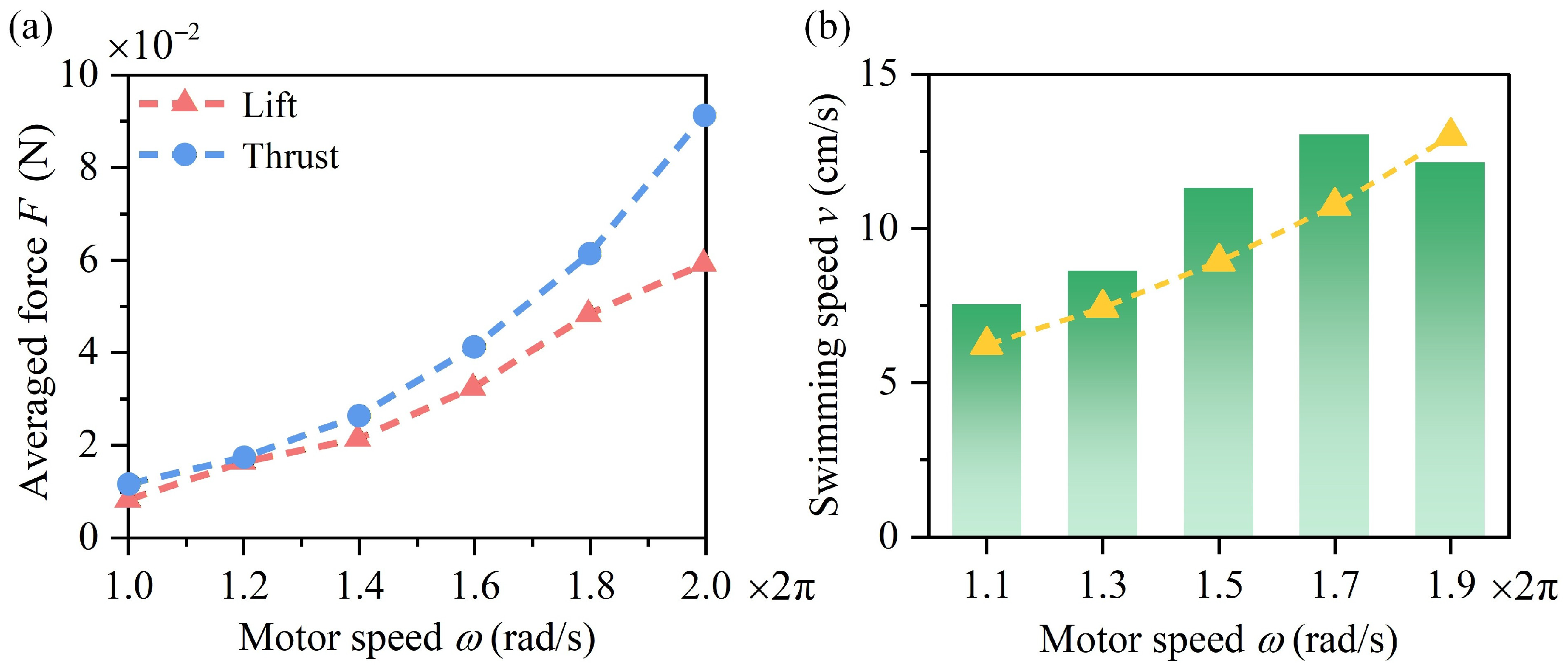 The flapping frequency of the pectoral fins is determined by the motor speed, which directly affects the swimming performance of the robotic fish. Using our theoretical model introduced in