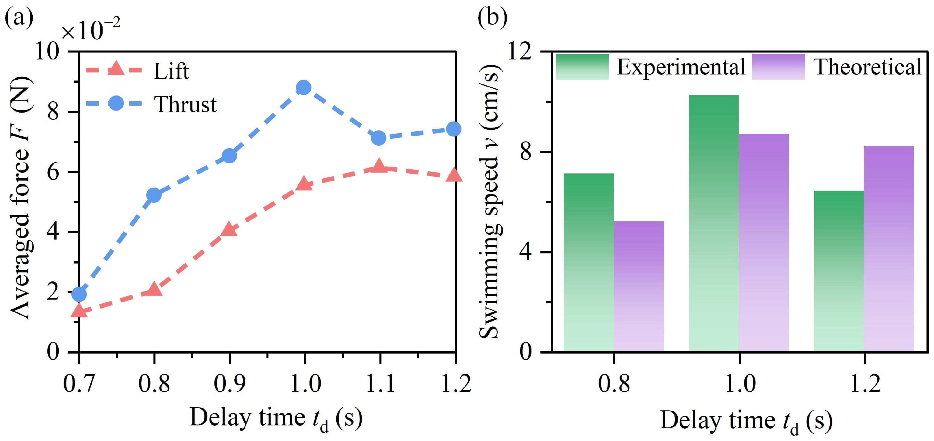 Figure 12b). In the cases of long delay times, the fin oscillations exhibit higher frequency and larger amplitude, leading to more pronounced turbulence. The mechanism underlying the discrepancies at different delay times is similar to that at different motor speeds. At short delay times, the theoretical model overestimates drag, whereas at long delay times, it overestimates thrust and underestimates drag.