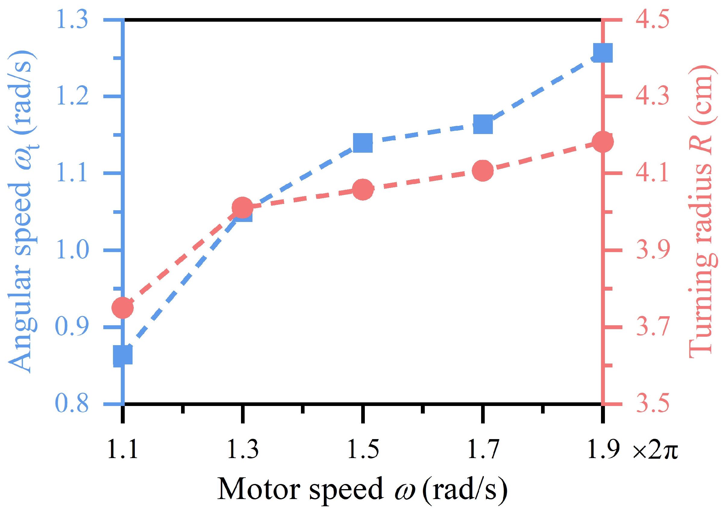 , the turning radius varies slightly, remaining appropriately 4 cm. The increase in the turning angular speed enhances the maneuverability and adaptability of the robot in complex aquatic environments. The small turning radius contributes to precise navigation during turning maneuvers.