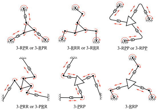 Parallel manipulators (PMs) are widely used in various fields because of their strong bearing capacity, high stiffness, and excellent dynamic performance []. Among them, 3-DOF planar parallel mechanisms (PPMs) are widely used in high-precision positioning and precise operation fields. Considering symmetry, planar parallel mechanisms can be classified into 10 types [], as shown in Figure 1, with single and double arrows representing revolute and prismatic joints, respectively. The underlined parts represent the driving joints. During the production process, deviations in manufacturing and assembly can arise, which may compromise the operational precision of PMs. The literature indicates that geometric inaccuracies are among the most significant contributors to these errors [,,]. Consequently, enhancing the accuracy of PMs continues to be a vital focus of research. Although methods like improving machining tolerances can aid in achieving higher precision, kinematic calibration has proven to be a more cost-efficient and practical approach for enhancing the positioning accuracy of such systems.