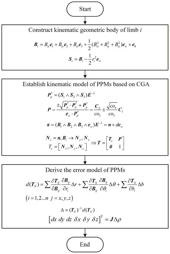 The main idea of the method in this paper is to use the meet operation in CGA to deal with the error modeling of PPMs. By means of rotation transformation, the position of the last joint of the limb can be obtained. With this point as the center, a sphere can be constructed. This process is called constructing a limb kinematic geometric body. Similar operations can be performed on other limbs. In this way, we can construct three spheres and intersect them to get the center point of the moving platform. The orientation of the moving platform can also be derived using the endpoints of limbs. By using differential operations, the error model of PPMs can be derived. The error modeling process is shown in Figure 3. The detailed content will be introduced in Section 3.1, Section 3.2 and Section 3.3.
