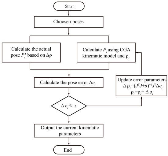 The redundant error parameters were analyzed using QR decomposition. It was found that the redundant error parameters were , , and . To avoid the influence of the redundant error parameters on the parameter identification results, these redundant error parameters were removed.