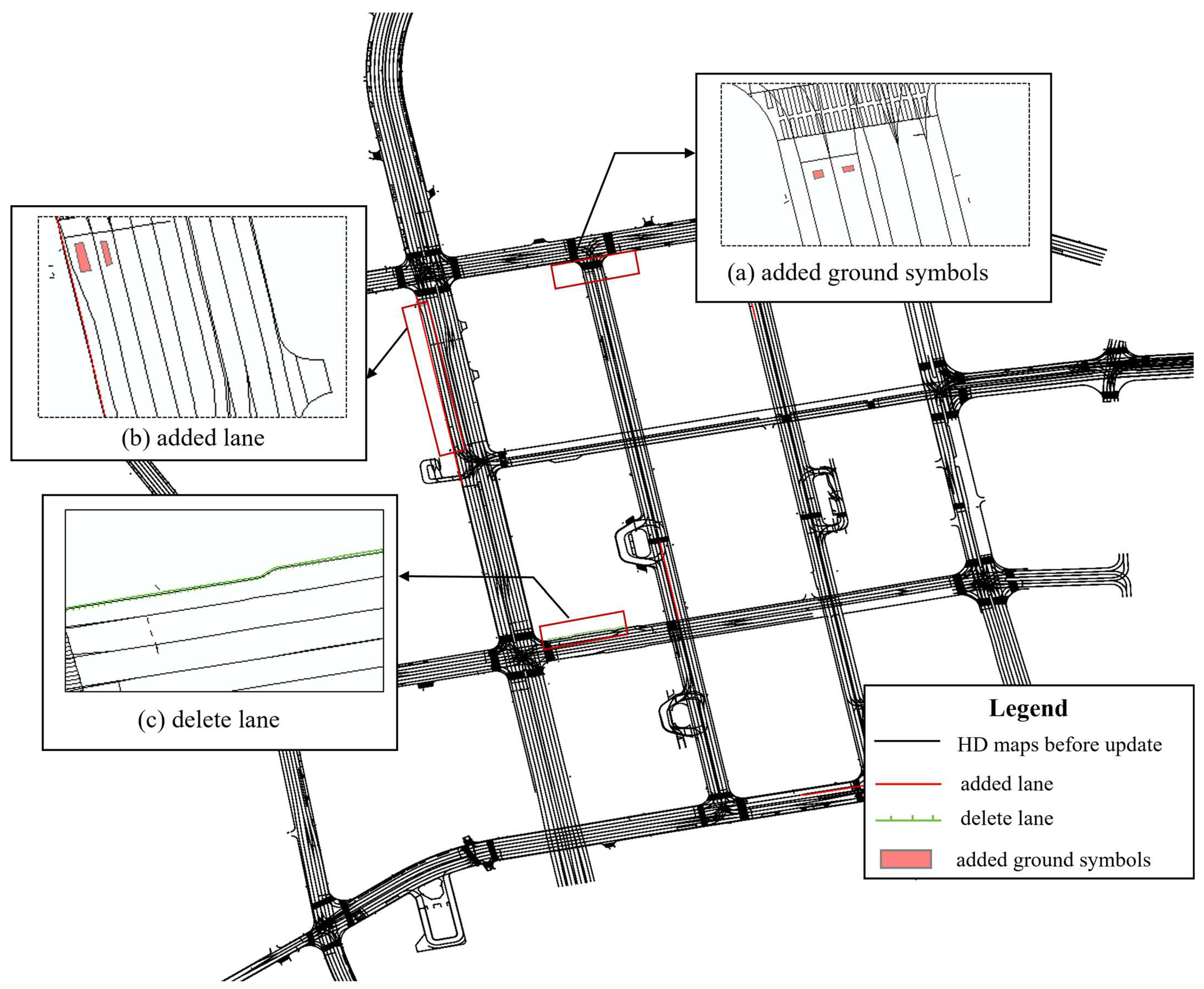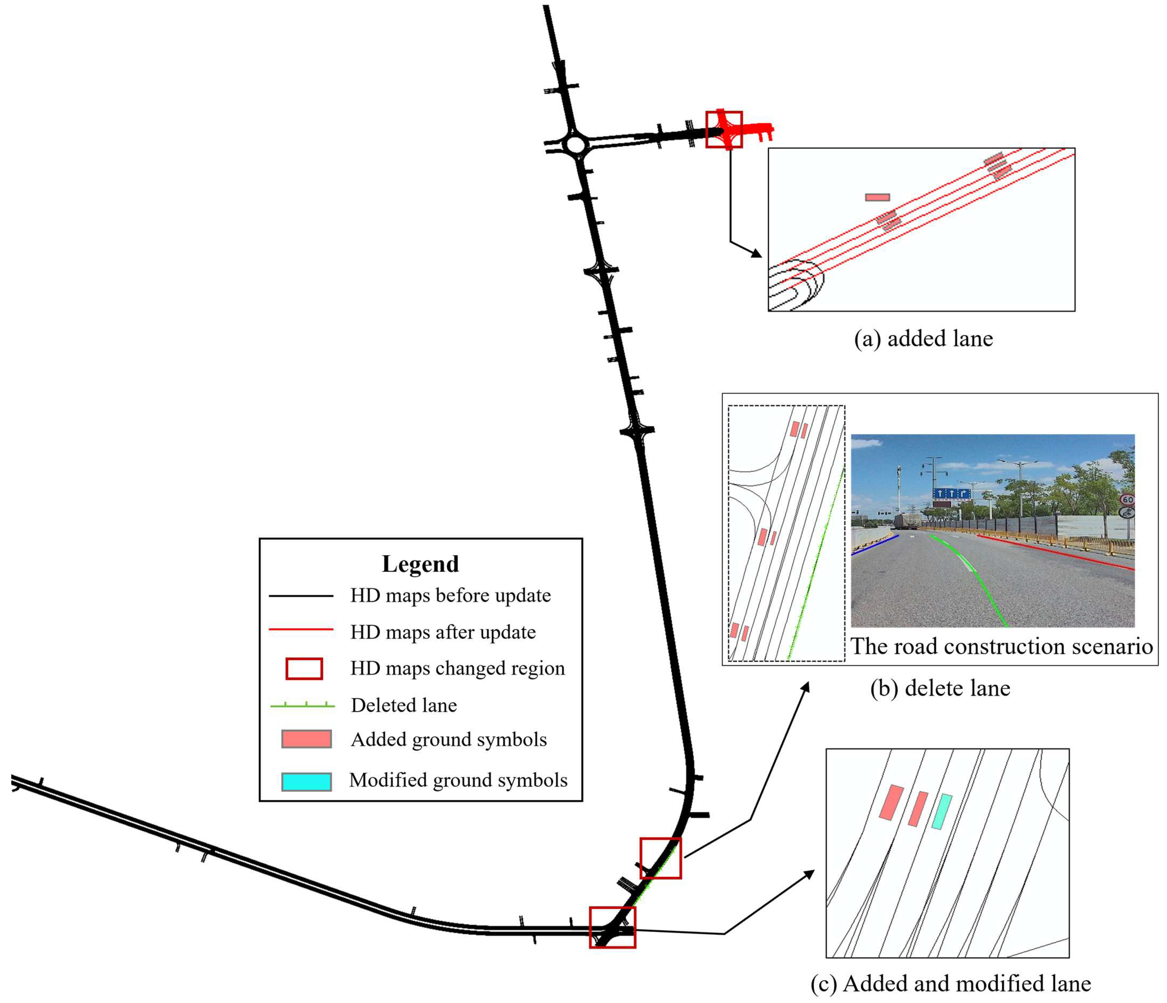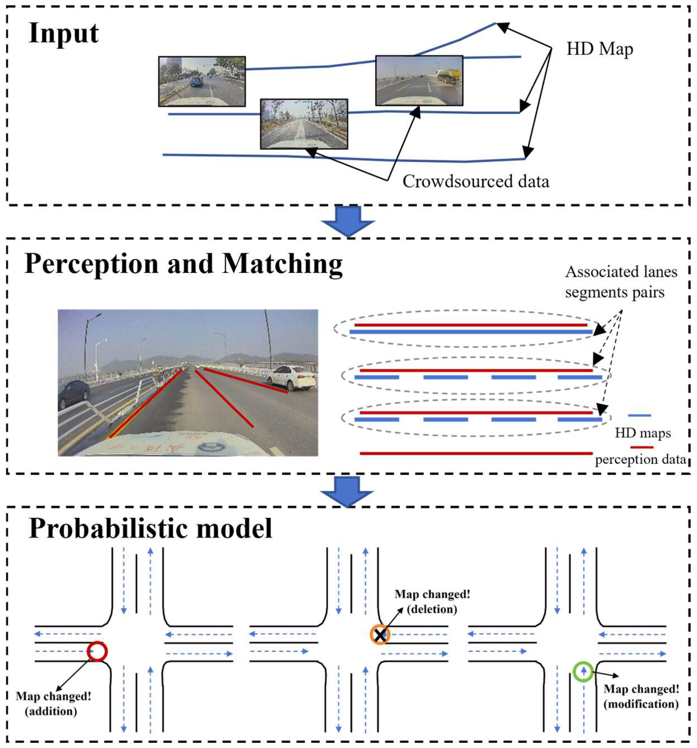 - A probabilistic update model that considers the uncertainty of single-vehicle perception data is developed, which integrates multi-source data to achieve precise map change detection.