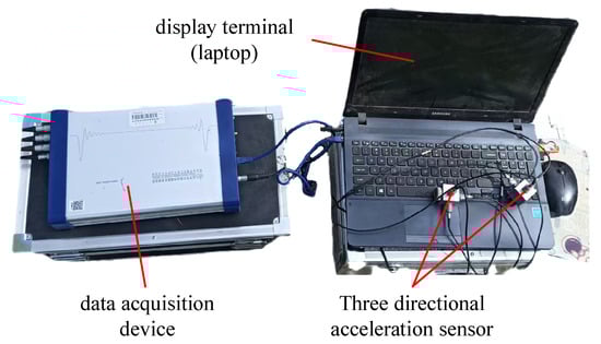 The vibration test system for the frame primarily consists of a triaxial accelerometer, a data acquisition unit, and a display terminal (laptop). The test adopts a continuous sampling method to collect vibration signals. The sampling frequency was set to 2560 Hz, the analysis frequency to 1000 Hz, the number of time-domain analysis points to 4096, the number of spectral lines to 1600, and the frequency resolution to 2.5 Hz.