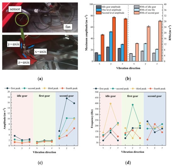The rotational speeds of the fan under idle, first-gear, and second-gear conditions are 1600, 2700, and 4275 r/min, respectively. According to Equation (2), the corresponding excitation frequencies are 53.4 Hz, 90 Hz, and 142.5 Hz. Vibration tests were conducted under all operating conditions, and the data were collected and processed. The maximum amplitude and root-mean-square values of the fan vibration signals were extracted. In the frequency domain, the four dominant peak values and their corresponding frequencies were obtained. The vibration signal data of the fan under different gear conditions are shown in Figure 3b–d.