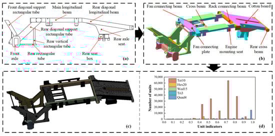 The frame of the cotton picker is primarily composed of longitudinal beams, transverse beams, and reinforcing ribs. After determining the dimensions and material of the frame, a 3D model of the chassis frame was created in SolidWorks 2018. The frame measures 6200 mm in length (along the forward direction), 2150 mm in width, and 1300 mm in height. It is mainly fabricated by welding sheet steel and tubular steel components of various specifications, all made from Q345 low-alloy high-strength steel. The 3D model of the frame is shown in Figure 5b. In the parametric modeling of the cotton picker frame, the solid model must be simplified to enhance the computational efficiency of the modal analysis [,]. Several aspects need to be considered. First, the effect of welding on the frame’s vibration characteristics was neglected. Second, all chamfers and fillets were simplified to sharp right angles. Third, process holes and small structures on the frame were ignored. Before conducting the finite element modal simulation, the frame material parameters were defined. The material used is Q345 structural steel with an elastic modulus of 210 GPa, a density of 7850 kg/m3, and a Poisson’s ratio of 0.3. The element type was set as CTRIA4 with an element size of 30 mm. The model was meshed regionally, resulting in 558,367 nodes and 354,012 elements, with an average mass of 0.71. The mesh generation results are shown in Figure 5c,d.
