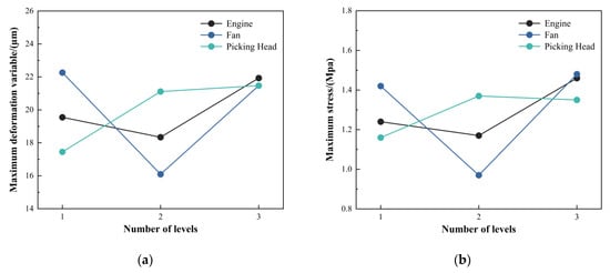 The maximum deformation and maximum stress of the frame were selected as evaluation indicators. The distance from the center of the power and transmission system to the front section of the central longitudinal beam is denoted as X1. X1 is defined at three levels: 1500 mm, 1575 mm, and 1650 mm. The distance from the center of the fan mounting plate to the front section of the central longitudinal beam, denoted X2, has three levels: 725 mm, 805 mm, and 885 mm. The distance from the center of the welding point between the front support plate and the central longitudinal beam to the front section of the main longitudinal beam is denoted X3 and has three levels: 275 mm, 335 mm, and 435 mm. An orthogonal experiment with three factors and three levels was used, yielding nine test groups. ANSYS finite element simulation software was used to evaluate the frame’s stress and strain under normal operating conditions. The results show that both stress and strain remained within the design range. The cotton picker exhibits more pronounced vibration in the second gear. Therefore, the vibration frequencies and amplitudes of the engine, fan, and picking head at this operating state were used as random vibration parameters and input to the model for response-spectrum analysis of the frame, as shown in Table 3.