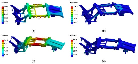 (a) Stress and deformation nephograms of the full-load bending condition; (b) Stress and deformation nephograms of the partial-load bending condition; (c) Stress and deformation nephograms of the full-load obstacle-crossing condition; (d) Stress and deformation nephograms of the unloading condition.