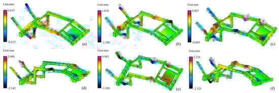 Modal analysis of the frame structure is a key component in the structural assessment of agricultural machinery during product development. These parameters of a modal analysis not only reflect the overall stiffness performance of the frame but also serve as critical indicators for controlling the entire machine’s vibration characteristics. Considering the actual working conditions of the cotton picker, the first six non-zero mode frequencies and shapes were extracted for analysis []. Based on the NX Nastran simulation module and the Lanczos method, dynamic analysis and frame calculation are performed. The first six natural frequencies and vibration modes of the cotton picker frame are obtained as shown in Figure 9.