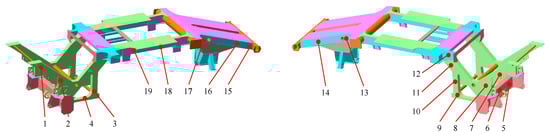 During the vibration test, to investigate the frame’s vibration characteristics, the structure was divided into several main components: the front axle, the picker header welded frame, the welded frame connecting plate, the central longitudinal beam, and the rear diagonal beam. A total of 19 representative measurement points were selected at these critical structural locations for testing. The selection of measurement points was intended to fully capture the global, local, and structural deformation properties of the cotton picker frame. Since the frame exhibits symmetry about its central axis, an asymmetrical distribution of the measurement points was adopted to enhance the accuracy and diversity of the test. Figure 12 presents the layout of the measurement points.