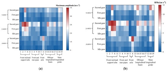 The vibration characteristics of the rear rectangular tube in the frame’s frontal regions were analyzed. As shown in Figure 13a,b, the dominant vibration direction of the rear rectangular tube is along the y-axis. In the x direction, the smallest vibration amplitude was observed at the lower regions of the rear vertical rectangular tube (Point 10). In contrast, the largest vibration amplitude occurred at the lower-middle regions of the rear vertical rectangular tube (Point 3). In the y direction, the minimum vibration amplitude also appeared at Point 3, whereas the maximum vibration amplitude was found at Point 10. In the z direction, the smallest vibration amplitude occurred at the middle regions of the rear rectangular tube (Point 4), and the maximum vibration amplitude was recorded at the rear regions of the rear rectangular tube (Point 9).