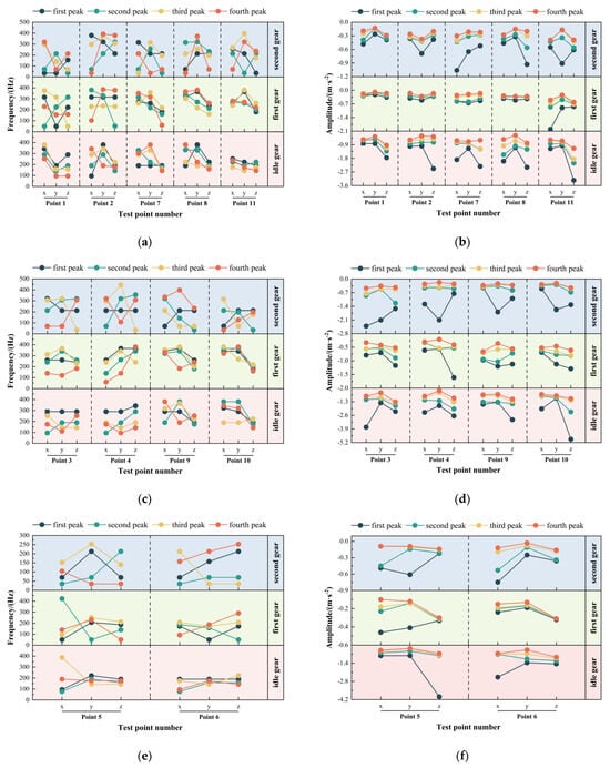 In engineering practice, low-order system frequencies are more likely to induce global structural vibrations with relatively large amplitudes. However, higher-order frequencies are generally far from the structure’s natural frequencies, resulting in relatively small vibration amplitudes. The vibration frequency range was set to 0–400 Hz based on the engine’s rated speed of 1900 r/min. A Fourier transform of the frame’s time-domain vibration signals was performed using the linear averaging method to obtain the first four vibration frequencies and their corresponding peak amplitudes. The frequency-domain signal data are presented in Figure 14, where the values above the table indicate the peak frequencies, and the values in parentheses represent the corresponding amplitudes.