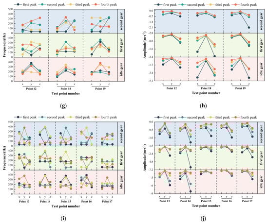Frequency-domain characteristics of each measuring point. (a) Frequency-domain signal frequency statistical diagram of the diagonal support rectangular tube of the frame; (b) Frequency-domain signal peak statistical diagram of the diagonal support rectangular tube of the frame; (c) Frequency-domain signal frequency statistical diagram of the rear rectangular tube in the front regions of the frame; (d) Frequency-domain signal peak statistical diagram of the rear rectangular tube in the front regions of the frame; (e) Frequency-domain signal frequency statistical diagram of the frame’s front axle; (f) Frequency-domain signal peak statistical diagram of the frame’s front axle; (g) Frequency-domain signal frequency statistical diagram of the main longitudinal beam; (h) Frequency-domain signal peak statistical diagram of the main longitudinal beam; (i) Frequency-domain signal frequency statistical diagram of the rear diagonal longitudinal beam; (j) Frequency-domain signal peak statistical diagram of the rear diagonal longitudinal beam.