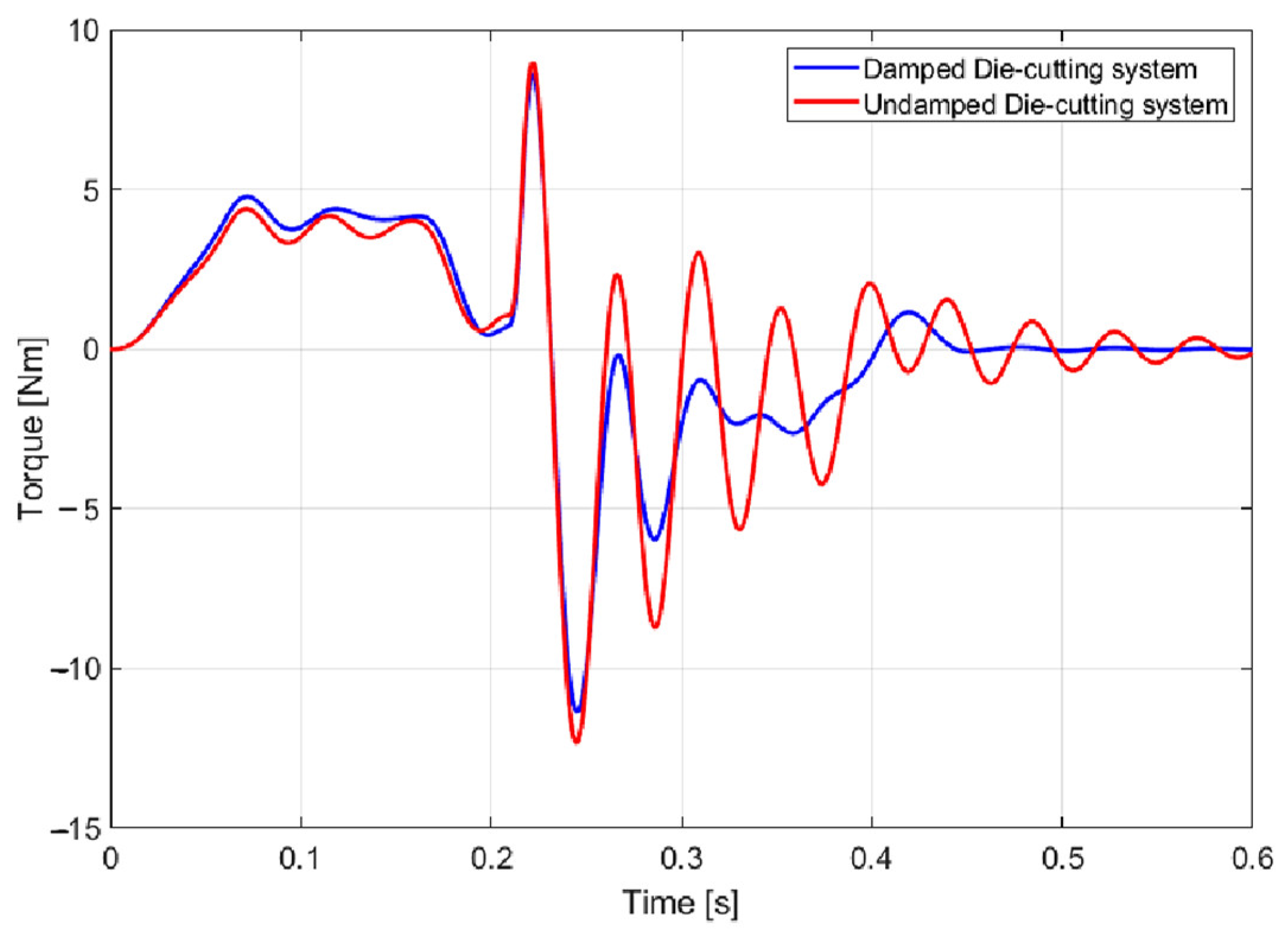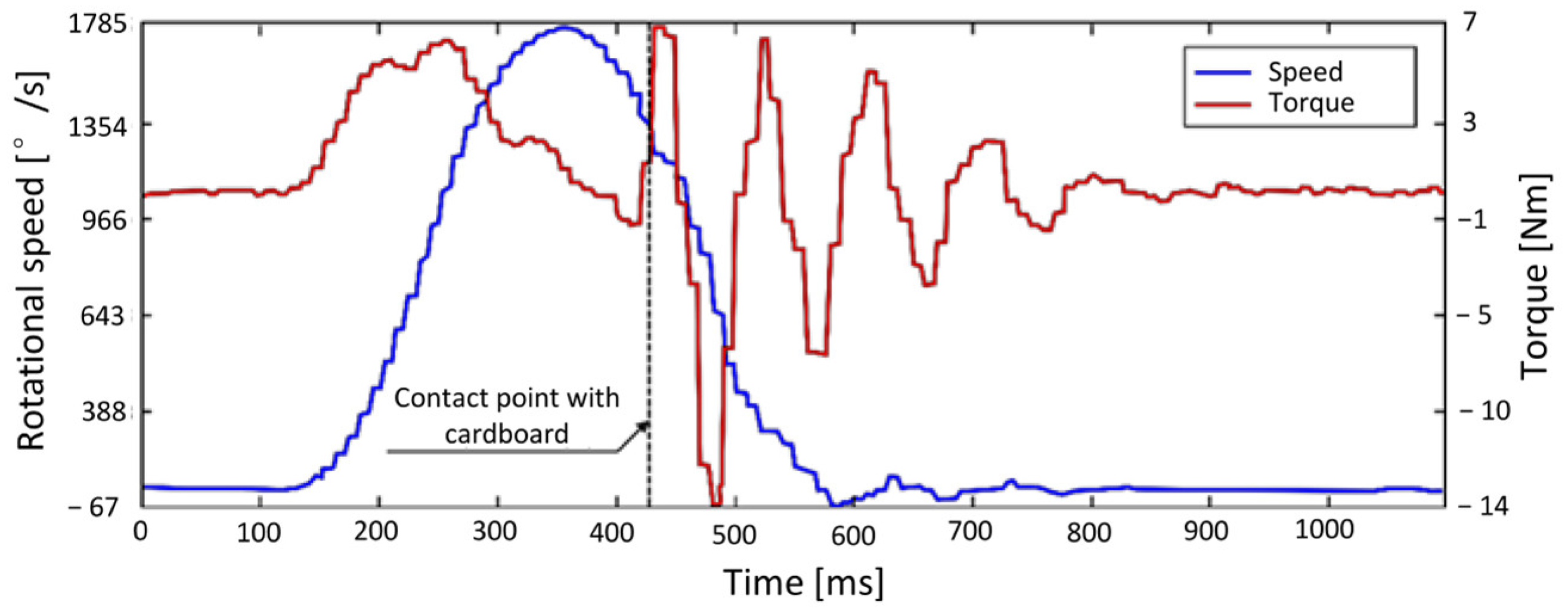 Inspection of the torque diagram in Figure 2 reveals pronounced oscillations beginning at the instant of contact. This behavior was initially attributed to the motor attempting to follow the prescribed motion law. In a closed-loop position and velocity control system, torque is adjusted to track the desired path. Upon impact, a sudden drop in blade rotational speed occurs, prompting the motor to increase torque to compensate. However, this corrective action is overestimated, particularly during braking, resulting in an even larger torque drop. Although the controller stabilizes the oscillations within approximately 0.5 s, neither returning the control parameters nor modifying the contact timing with the cardboard significantly reduces these effects.