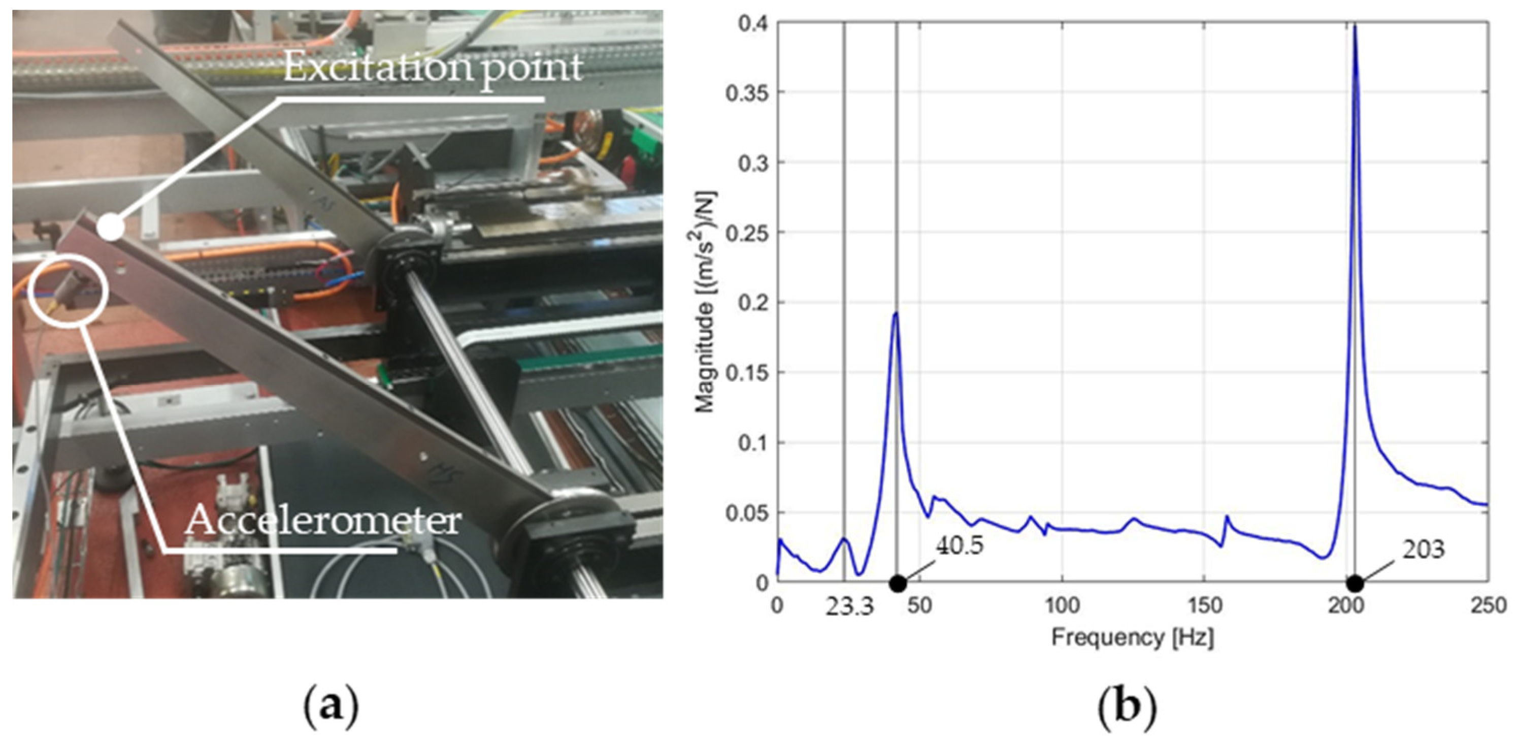 It should also be noted that the diagrams in Figure 2 are influenced by software misconfiguration: the motor was programmed for a 360° rotation, with the transmission ratio of the gear reducer set to 5 instead of the actual 180° rotation and a ratio of 10. This error effectively doubles the rotational speed and halves the oscillation frequency, measured at 11.5 Hz.