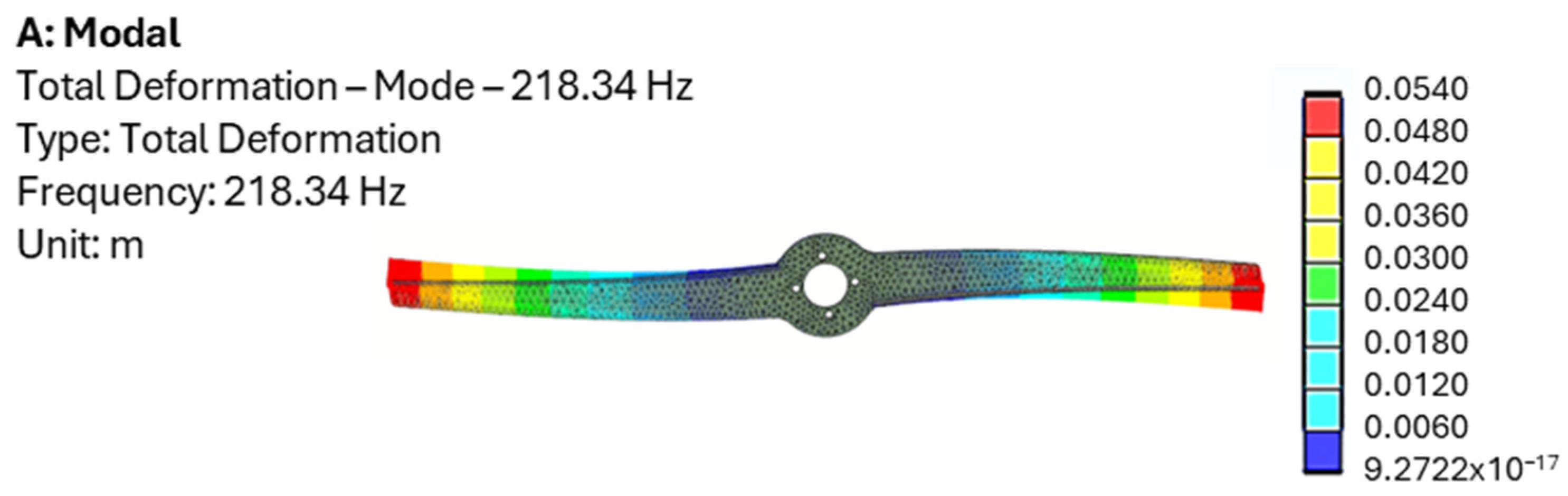 Figure 4 presents the modal analysis of the blade. The frequency discrepancy with the measured value of Figure 3b is due to the boundary conditions used in the model, which assumed a fully fixed constraint instead of the four-bolt connection.