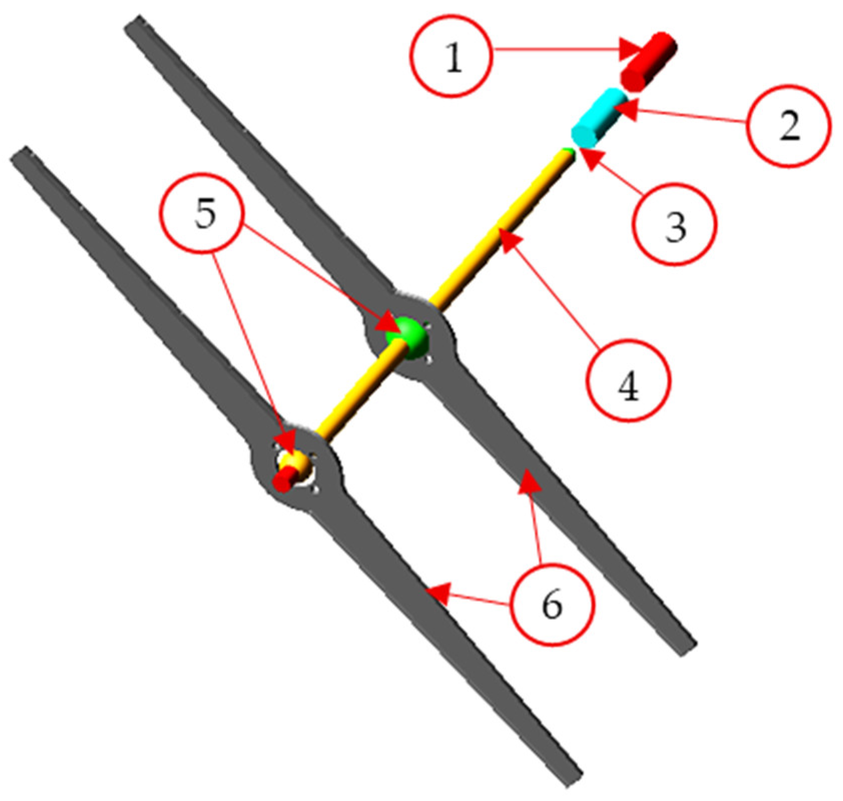 The rotational speed profile from Figure 2 was replicated in MATLAB R2018a [23], appropriately scaled, and imported into Adams as a prescribed motion using Akima spline interpolation. The motor (1), using a proportional and derivative controller, calculates the necessary torque to be able to reproduce the real kinematic. Rotational joints are employed to connect components, while a coupler (3) simulates the gear reducer placed between the elastic joint (2) and the shaft (4). This is the only flexible element in the model presented in Figure 5, and, in terms of stiffness, it is divided into two components: K1, between the left blade and the gear reducer, and K3, between the two blades. Dummy spheres and torsional springs (5) replicate the spline balls’ behavior connecting the blades (6) to the shaft. The rotor is supported by four hinges, located close to the motor, the elastic joint, and both dummy spheres. The main uncertainties in this model lie in the magnitude of the impact forces, which simulate collision with the paperboard, and the controller design parameters. Mechanical properties of the elements are summarized in Table 4.