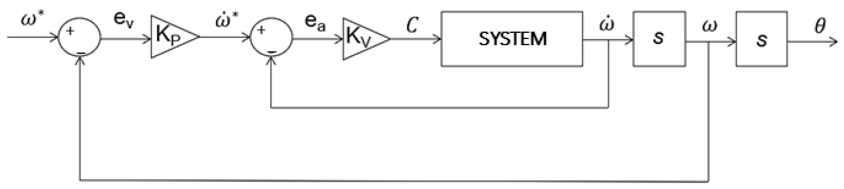 The system shown in Figure 5 performs a 180° rotation driven by the motion controller integrated into the electric motor; see Figure 6. By adjusting the rotational speed profile of Figure 2 and imposing it as the desired reference curve, ω*, the corresponding torque is applied to the rotor. Note that the control parameters Kp and Kv were assumed, since no information about the actual controller was available. During the simulation, a pair of forces was applied to the blades to reproduce the impact with the paperboard. The magnitude of these forces was computed from the torque jump exhibited inside in a previous work of Morettini et al. [24].