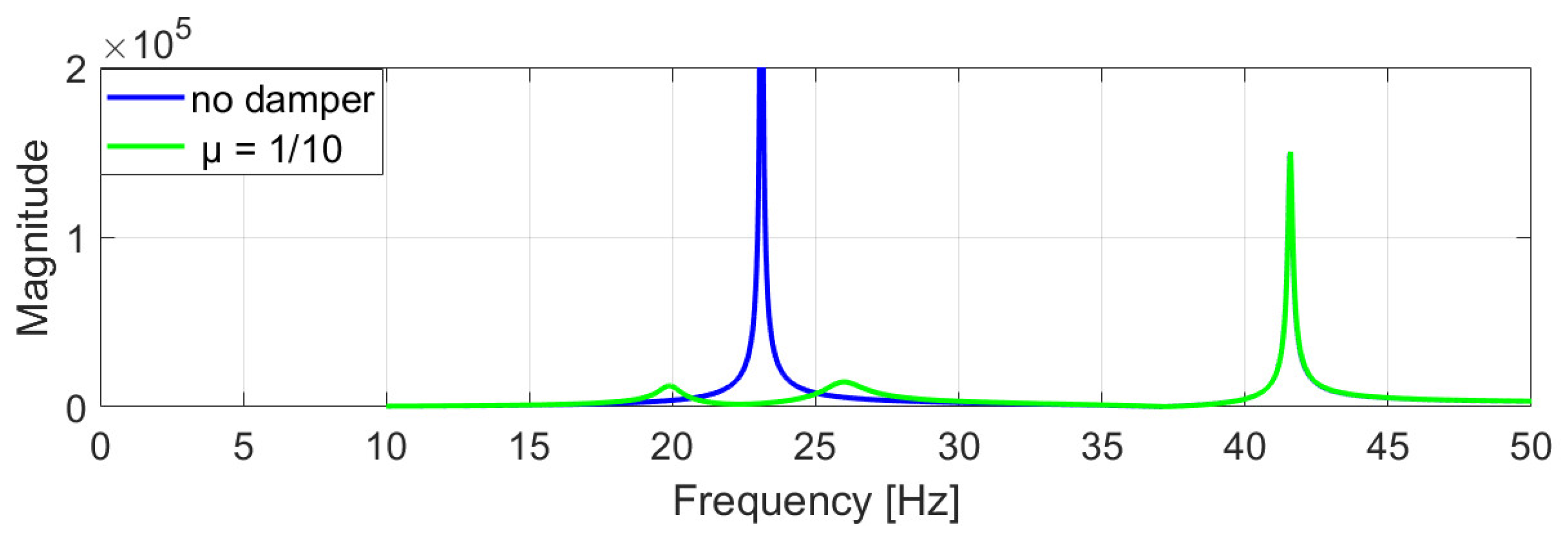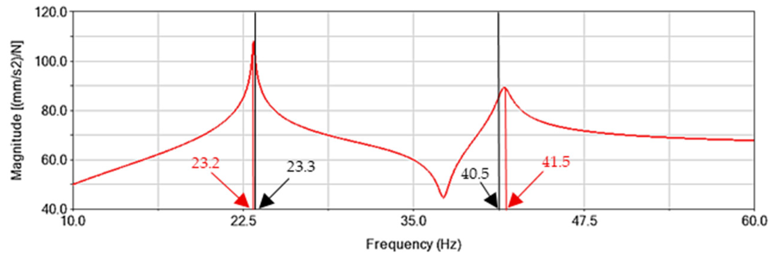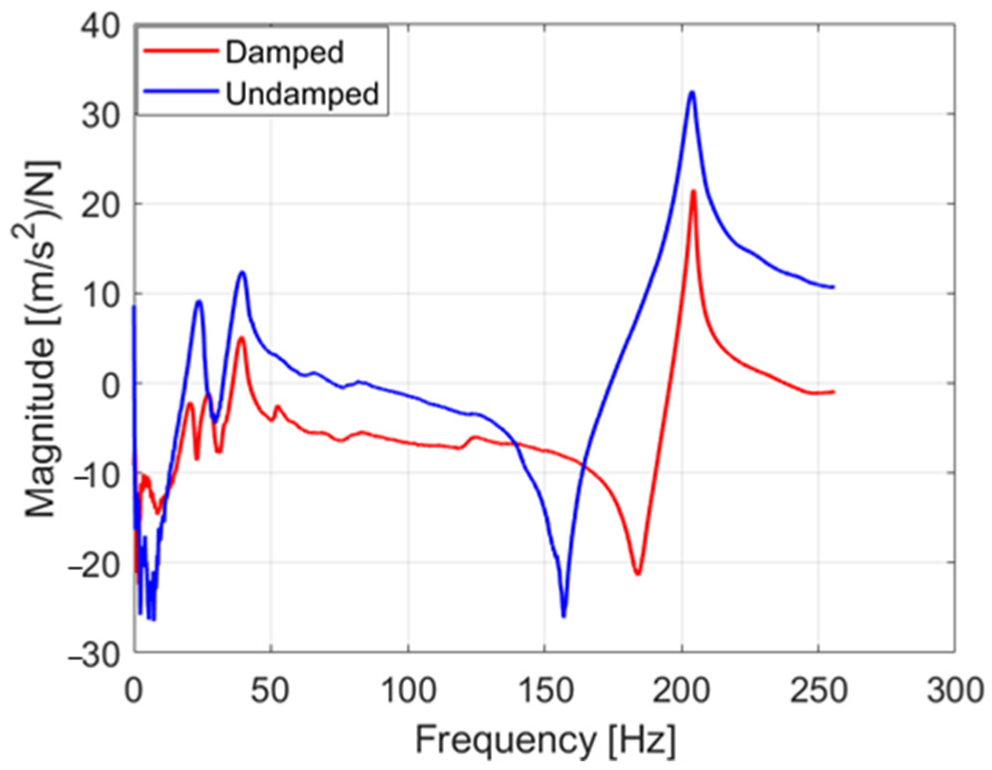 As can be seen from Figure 13, which presents a comparison of the frequency response analysis, a significant reduction in the first frequency amplitude is obtained.