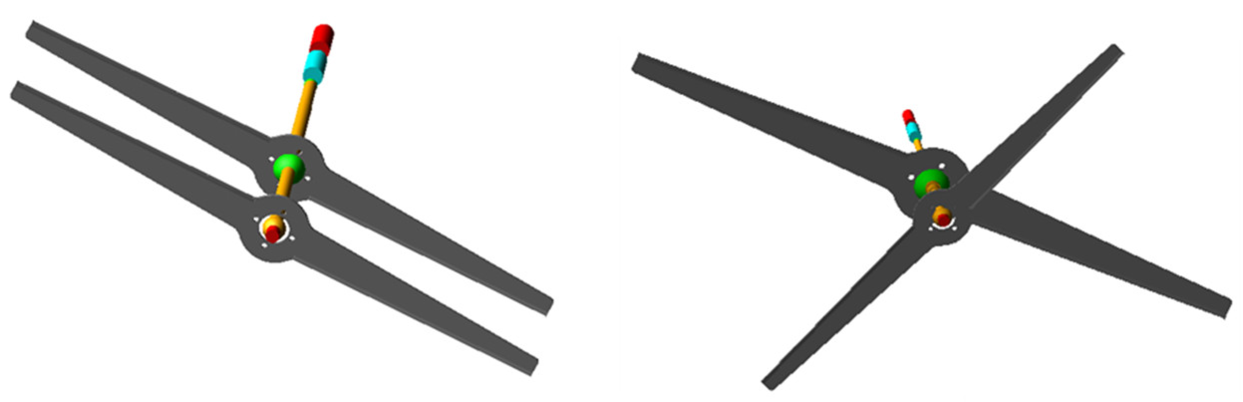 Integrating a new device into the rolling blades poses significant challenges. The first torsional mode of the rotor involves synchronous blade vibrations; consequently, the shaft section between the blades stores negligible elastic energy and behaves as part of the rotor inertia rather than as a spring. In Figure 12, FEA was conducted to corroborate this concept. As expected, no deformation gradient is present along the shaft axis during the first torsional mode of the rotor. Therefore, the added inertia is located and connected in this section.